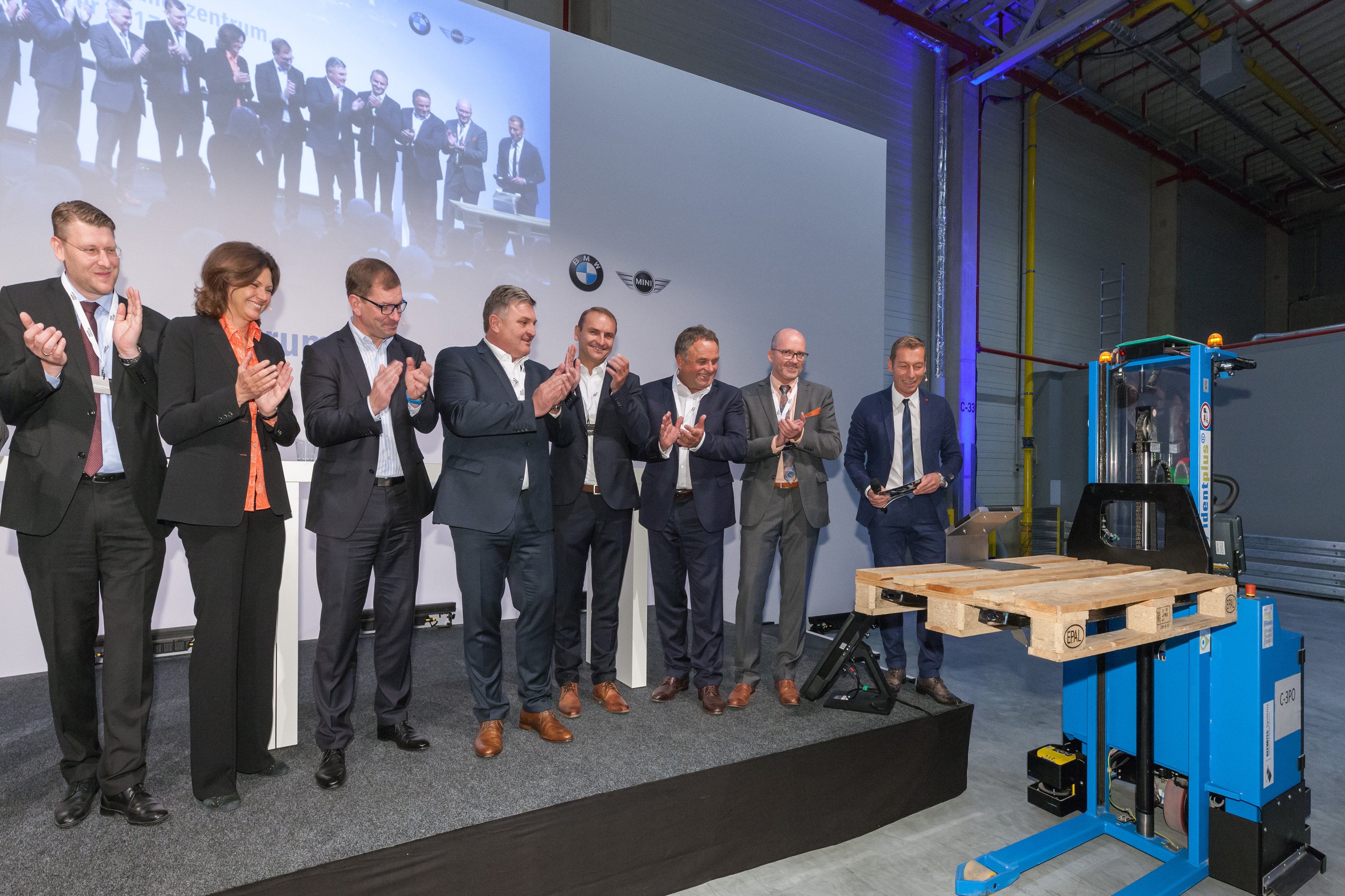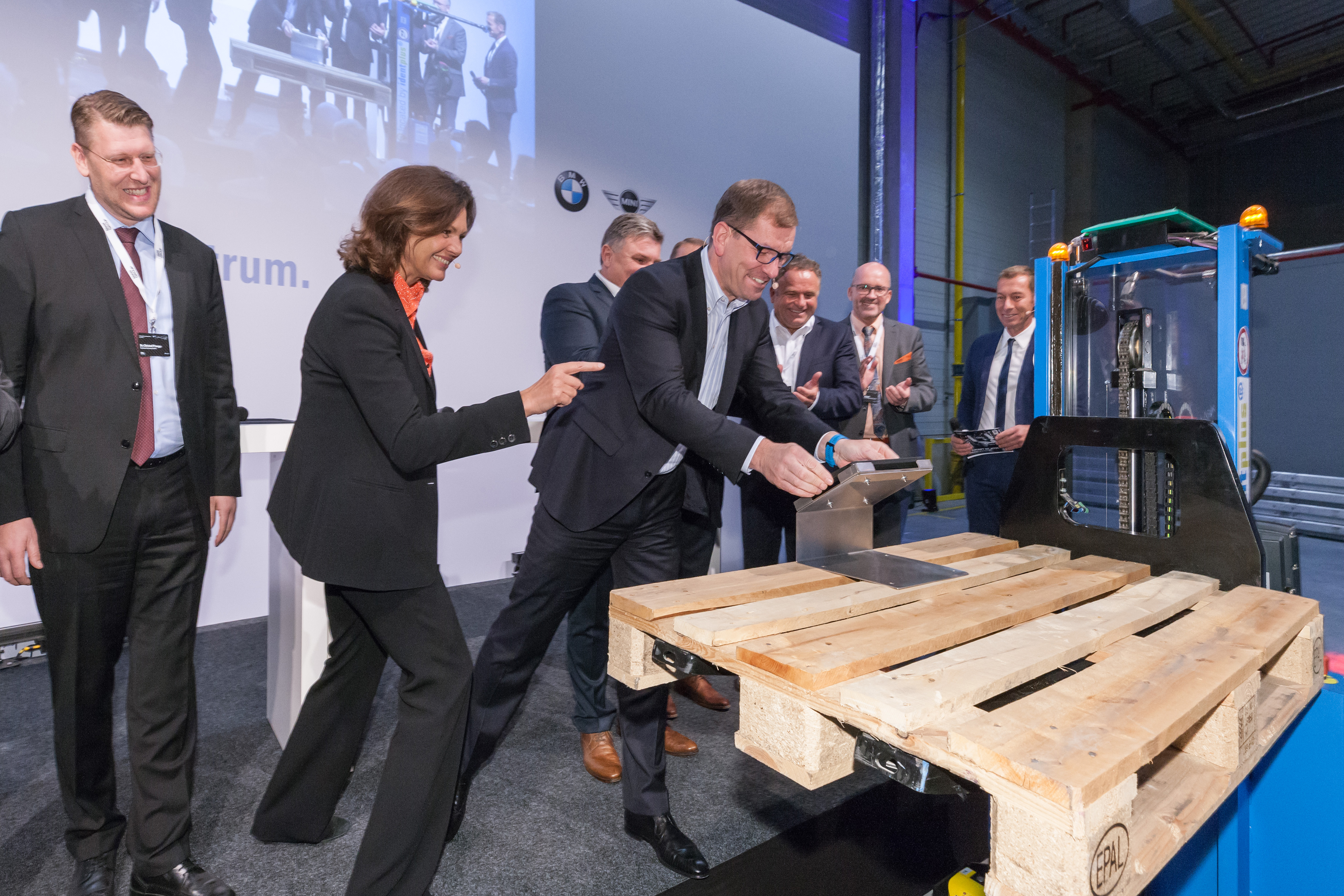 Symbolische Inbetriebnahme des neuen Versorgungszentrums im BMW Group Werk Landshut per Fingerdruck auf ein Tablet: Andreas Wagner, Mitglied des Vorstands, Schnellecke Logistics; Alexander Putz, Oberbürgermeister der Stadt Landshut; Peter Dreier, Landrat des Landkreises Landshut; Christof Prange, Head of Business Development, Goodman Deutschland; Ilse Aigner, Bayerische Staatsministerin für Wirtschaft und Medien, Energie und Technologie; Markus Duesmann, Mitglied des Vorstands der BMW AG, Einkauf und Lieferantennetzwerk; Hermann Dechantsreiter, Leiter Strategie, Strukturintegration, Logistik, BMW Group Werk Landshut; Peter Fallböhmer, Leiter BMW Group Werk Landshut; Willibald Löw, Betriebsratsvorsitzender BMW Group Werk Landshut; Andreas Strauß, 1. Bürgermeister der Marktgemeinde Ergolding (v. l. n. r.) (09/2017)