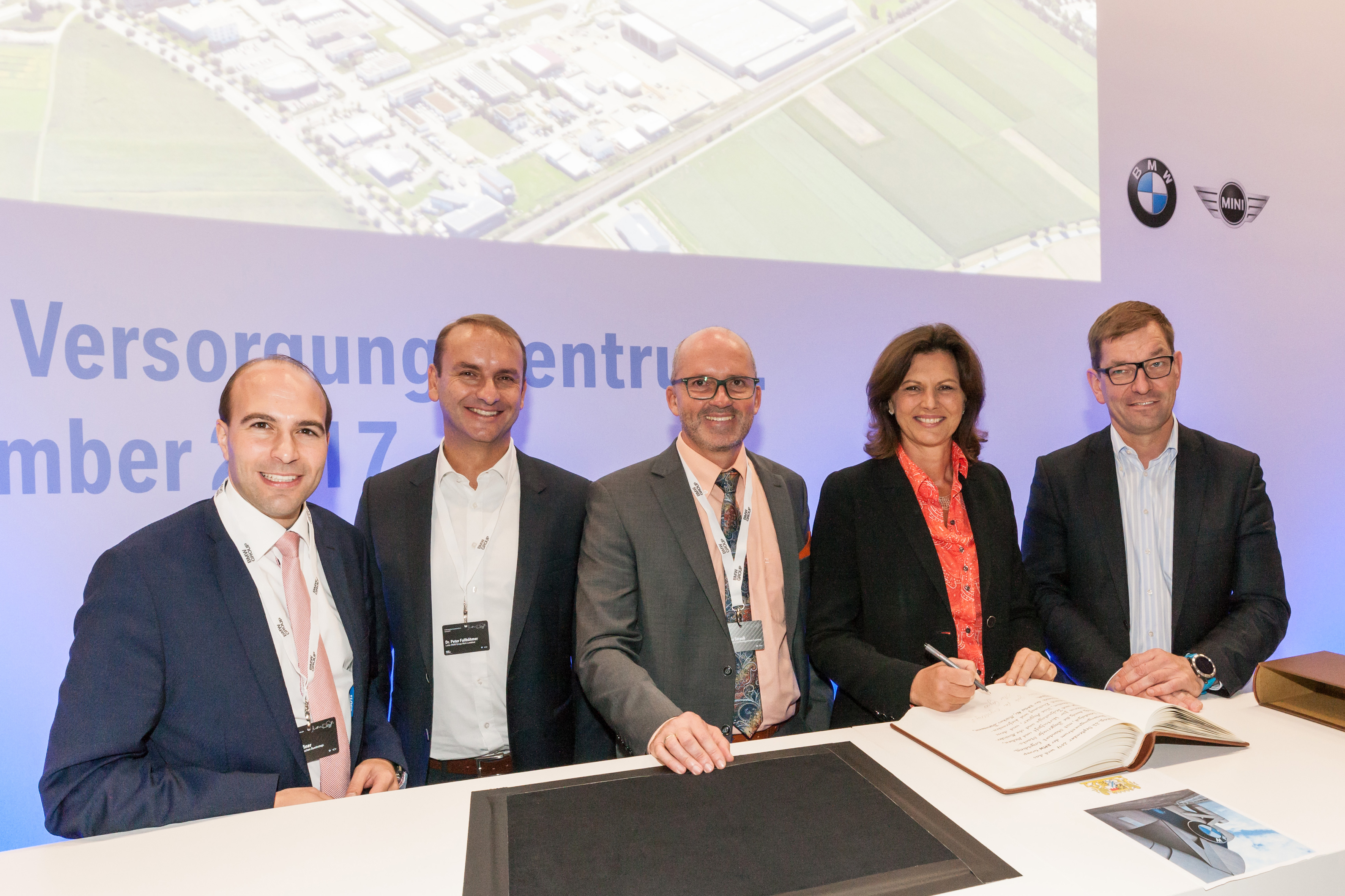 Staatsministerin Ilse Aigner (2. v. r.) und BMW Group Vorstandsmitglied Markus Duesmann (1. v. r.) beim Eintrag in das Goldene Buch der Marktgemeinde Ergolding (09/2017)