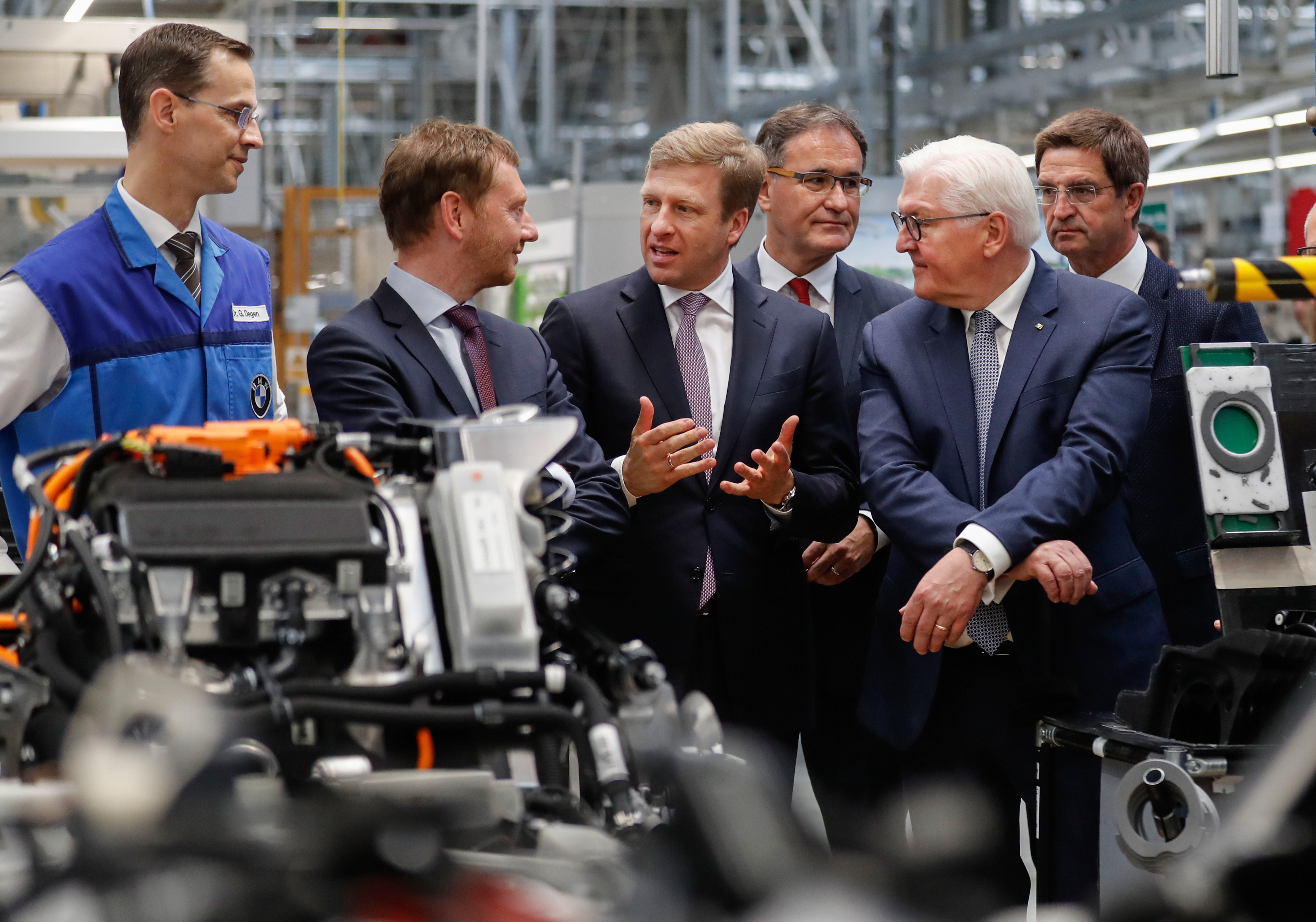 Bundespräsident Steinmeier mit BMW Produktionsvorstand Oliver Zipse (rechts im Bild) sowie mit Führungskräften und Mitarbeitern des BMW Group Werks Leipzig. (05/2019)