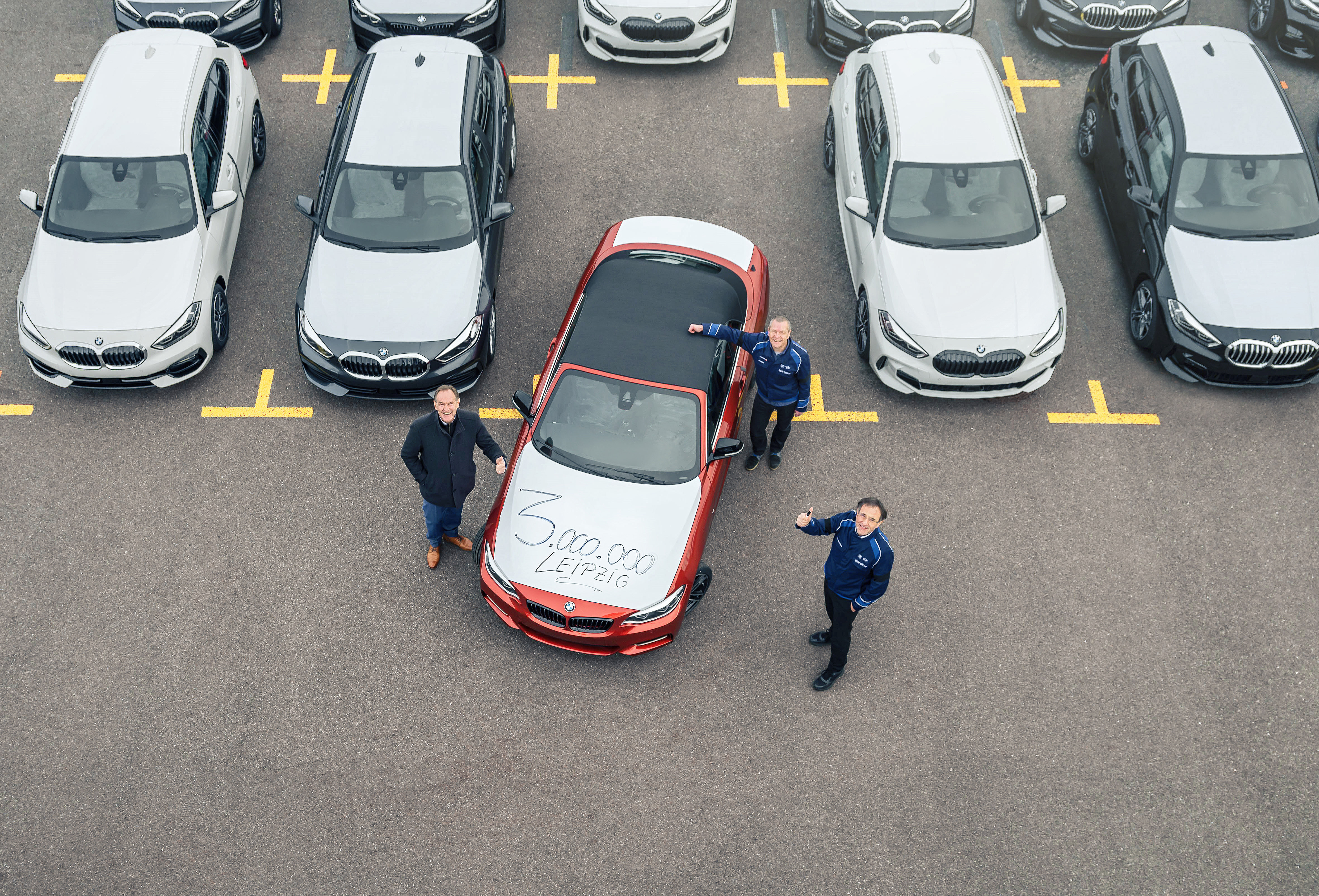 3.000.000 BMW Fahrzeuge „made in Leipzig“: Leipzigs Oberbürgermeister Burkhard Jung (links), Werkleiter Hans-Peter Kemser (vorne) und der Betriebsratsvorsitzende des Werks Leipzig, Jens Köhler (rechts) mit dem Jubiläumsfahrzeug, einem BMW M240i Cabrio in Sunset Orange