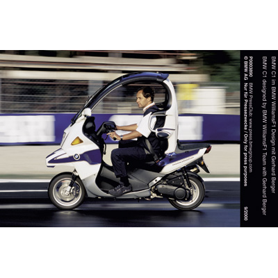 Der BMW C1 im BMW WilliamsF1 Team Design, gefahren von BMW Motorsport Direktor Gerhard Berger / BMW Motorsport Director Gerhard Berger riding the BMW C1 which carries the livery of the BMW WilliamsF1 Team