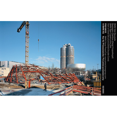 BMW Welt Baustelle Baubeginn Stahlbau (Detail Doppelkegel) (02/2005)