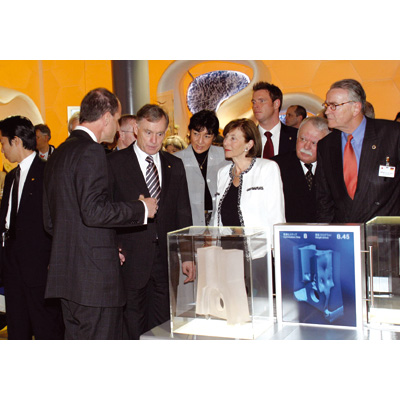 Hoher Besuch auf dem BMW EXPO-Stand in Aichi/Japan: Bundespräsident Prof. Dr. Horst Köhler (3.v.l.)und seine Frau Eva im Gespräch mit Dr. Markus Baur, Leiter des BMW Group Technology Office in, Japan (04/2005)