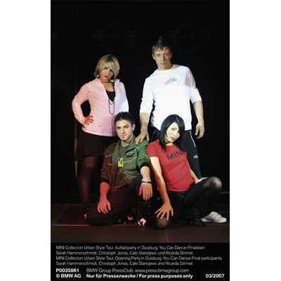 MINI Collection Urban Style Tour. Auftaktparty in Duisburg. You Can Dance-Finalisten Sarah Hammerschmidt, Christoph Jonas, Cale Stanojevic und Ricarda Stirmer. (03/2007)