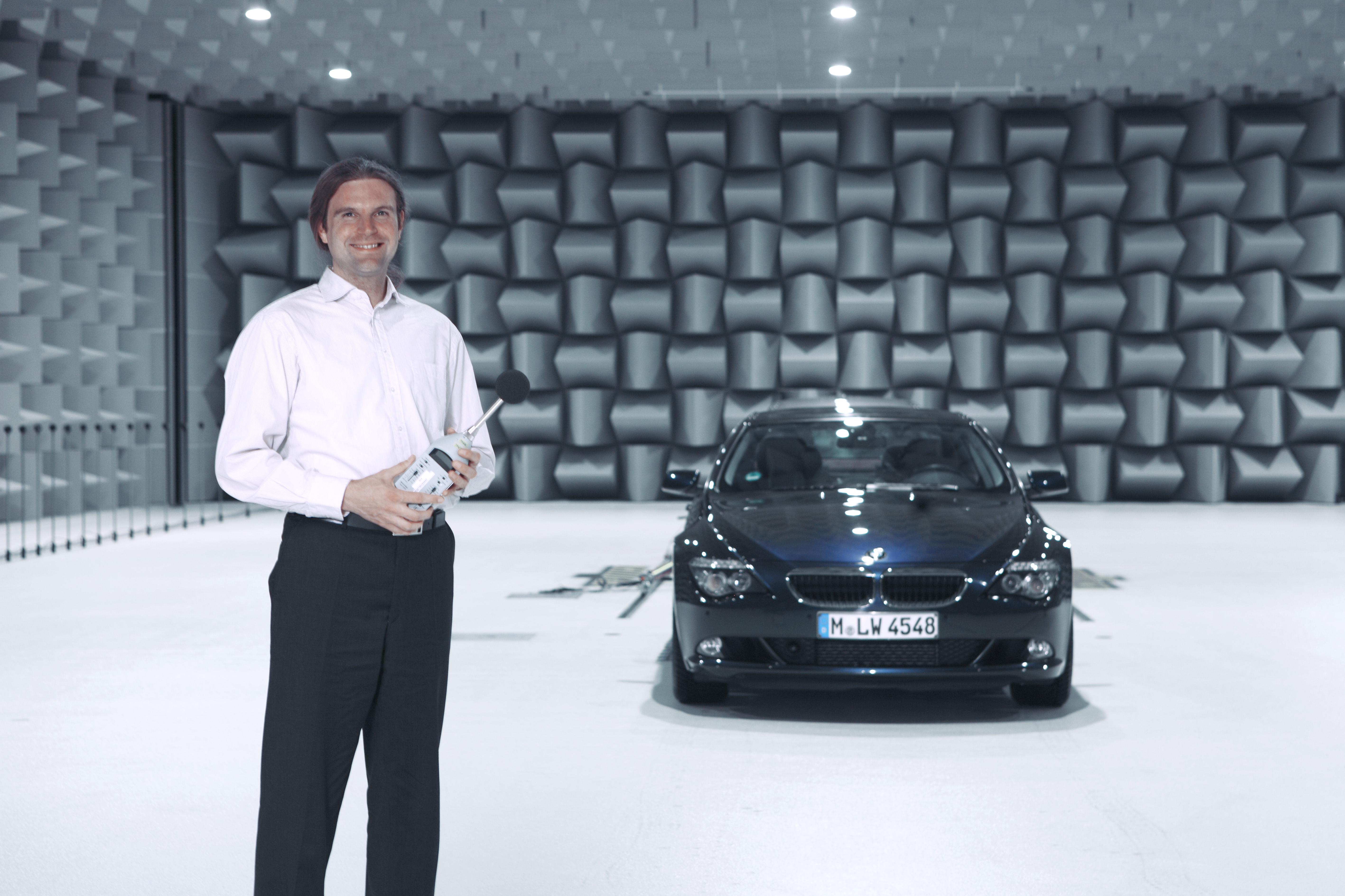 Manuel Reichle, Tonmeister, und der BMW 635d mit Aktivem Sounddesign im BMW Group Akustikprüfstand (05/2010)