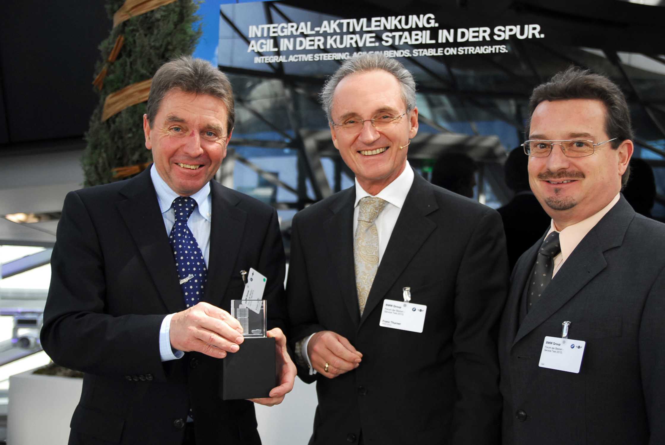 Von links: Xaver Auer (Autohaus Auer), Franz Thurner, Leiter Aftersales, und Claus Tengler (Autohaus Auer) bei der Pokalübergabe an die 70 besten Betriebsstätten im BMW Service Test 2010 am 7.12. im Doppelkegel der BMW Welt (12/2010)