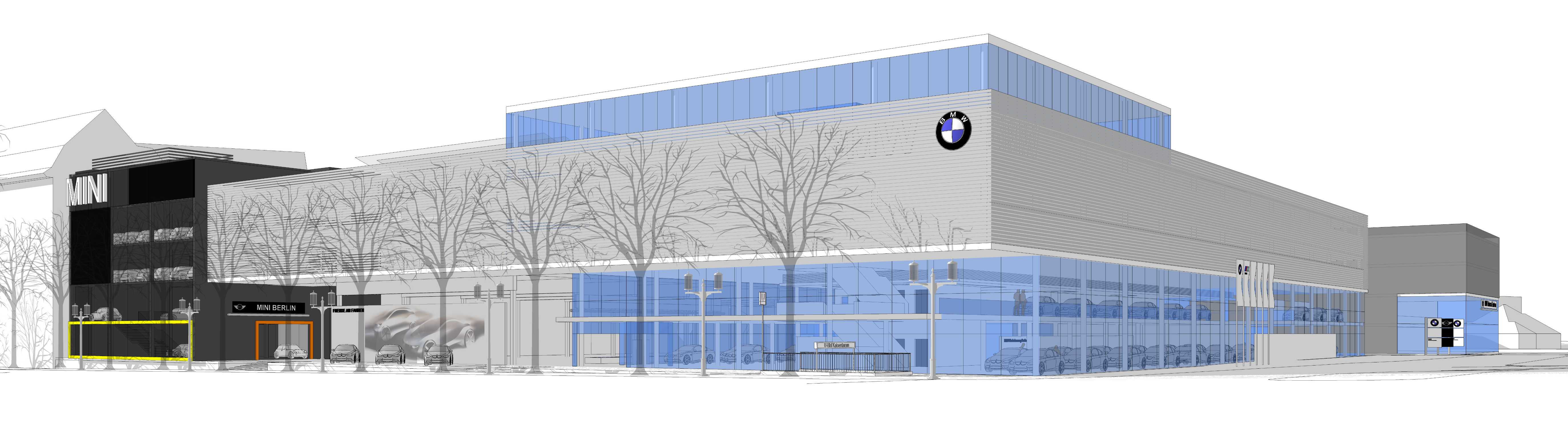 Neubau BMW Group Niederlassung Berlin, Perspektive Kaiserdamm/Ecke Messedamm, Rendering Bildnachweis "Visualisierung: Lanz Architekten + ...
