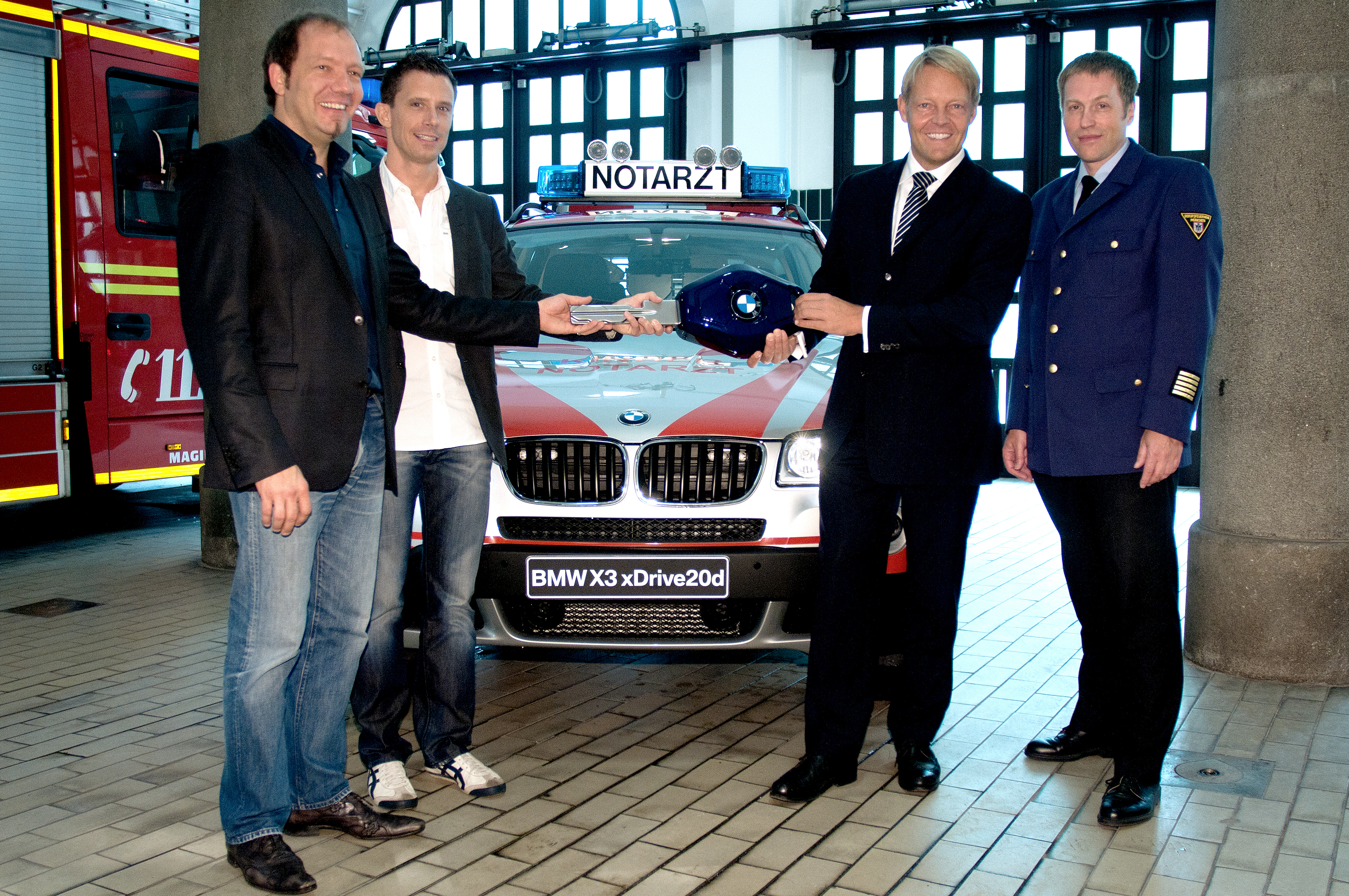 Spende des neuen Einsatzfahrzeuges BMW X3 xDrive 20d an den Münchner Kindernotdienst (von links nach rechts: Dr. Ludwig Schmid und Dr. Florian Hoffmann, Kindernotärzte; Christoph v. Tschirschnitz, BMW GROUP Leiter Vertrieb an Direktabnehmer; Wolfgang Schäuble, Oberbranddirektor und Leiter der Berufsfeuerwehr München). (07/2011)