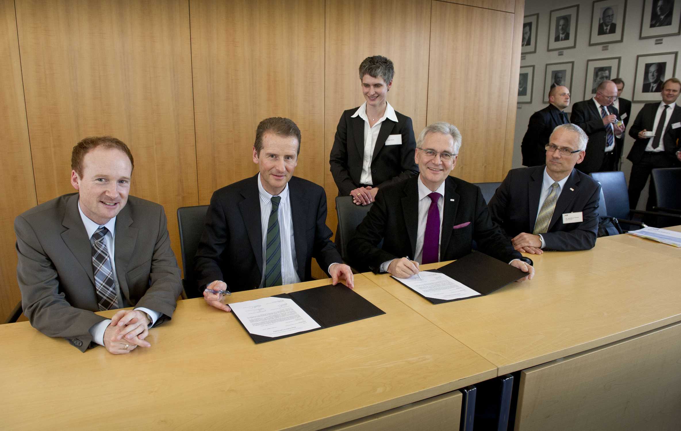 Die BMW Group und das Karlsruher Institut für Technologie (KIT) verstärken ihre Zusammenarbeit. Unterzeichnung des Memorandum of Understanding am 01.03.2012 in Karlsruhe. v.l.n.r.: Hendrik Lang, BMW Group, Leiter Einkauf, Produktion und Technologie Sitze und Sitzkomponenten; Dr. Herbert Diess, Mitglied des Vorstands der BMW AG, Einkauf und Lieferantennetzwerk; Dr. Peter Fritz, Vizepräsident für Forschung und Innovation des KIT, und Dr. Joachim Knebel, Chief Science Officer KIT. Stehend: Dr. Mirjam Storim, BMW Group, Projektleiterin Hochschulkooperationen. (03/2012)