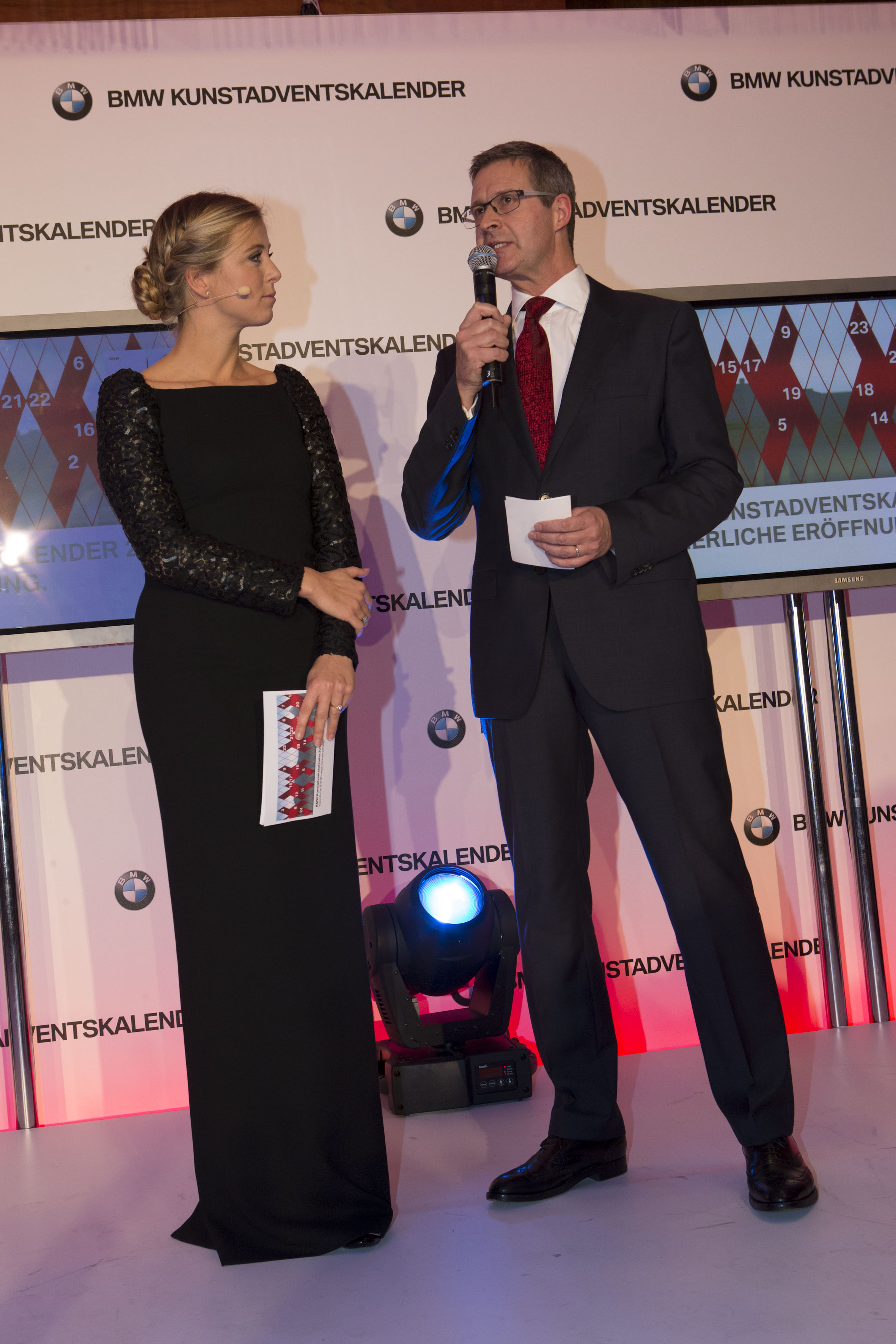 BMW Kunstadventskalender, Frankfurt, 01.12.2012: Begrüßung Johannes Seibert; Nina Eichinger, Moderatorin, Johannes Seibert, Leiter Marketing Vertrieb ...