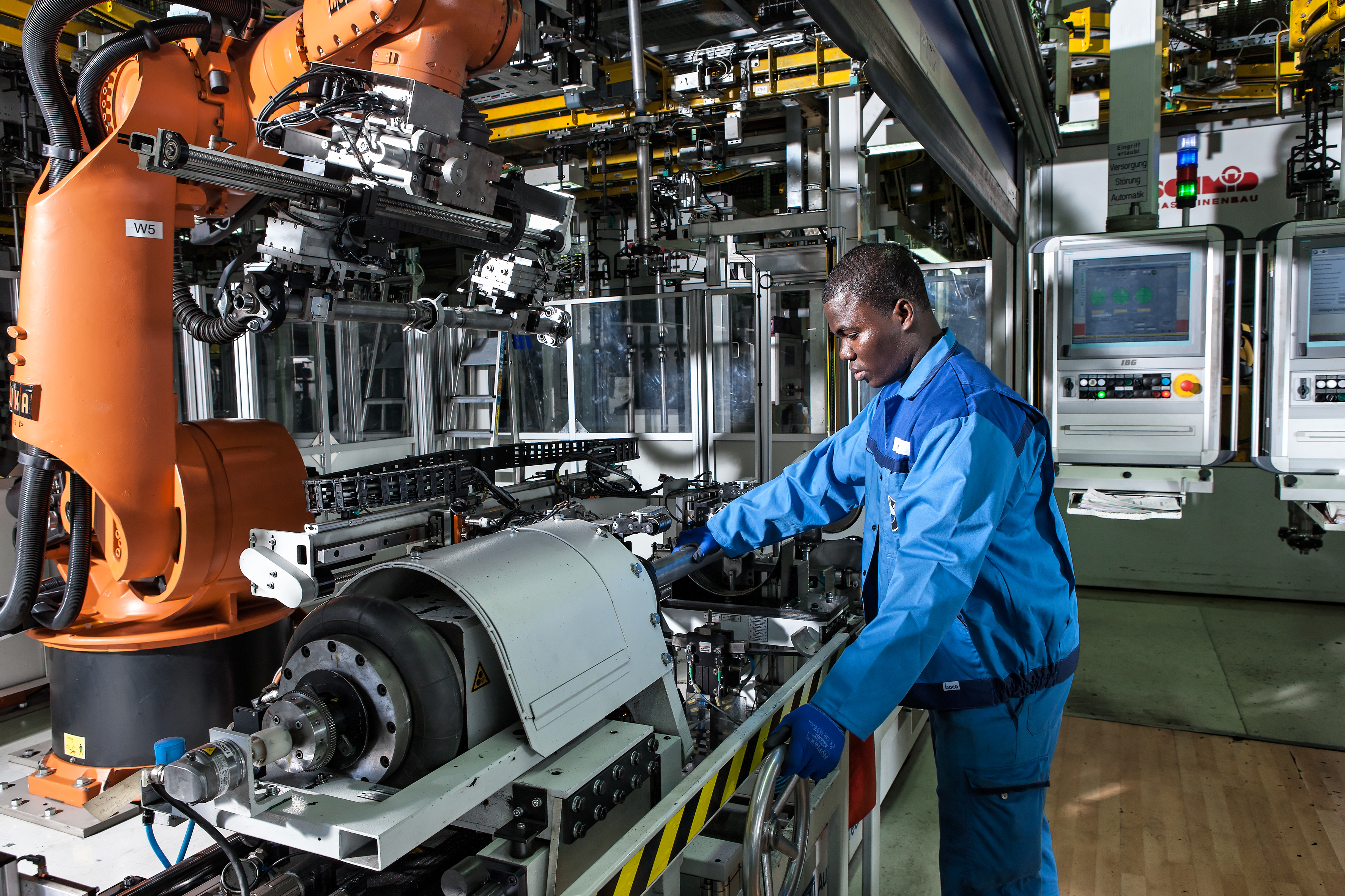 BMW Werk Landshut: Gelenkwellenfertigung: Ein Mitarbeiter wuchtet eine Gelenkwelle aus (02/2013)