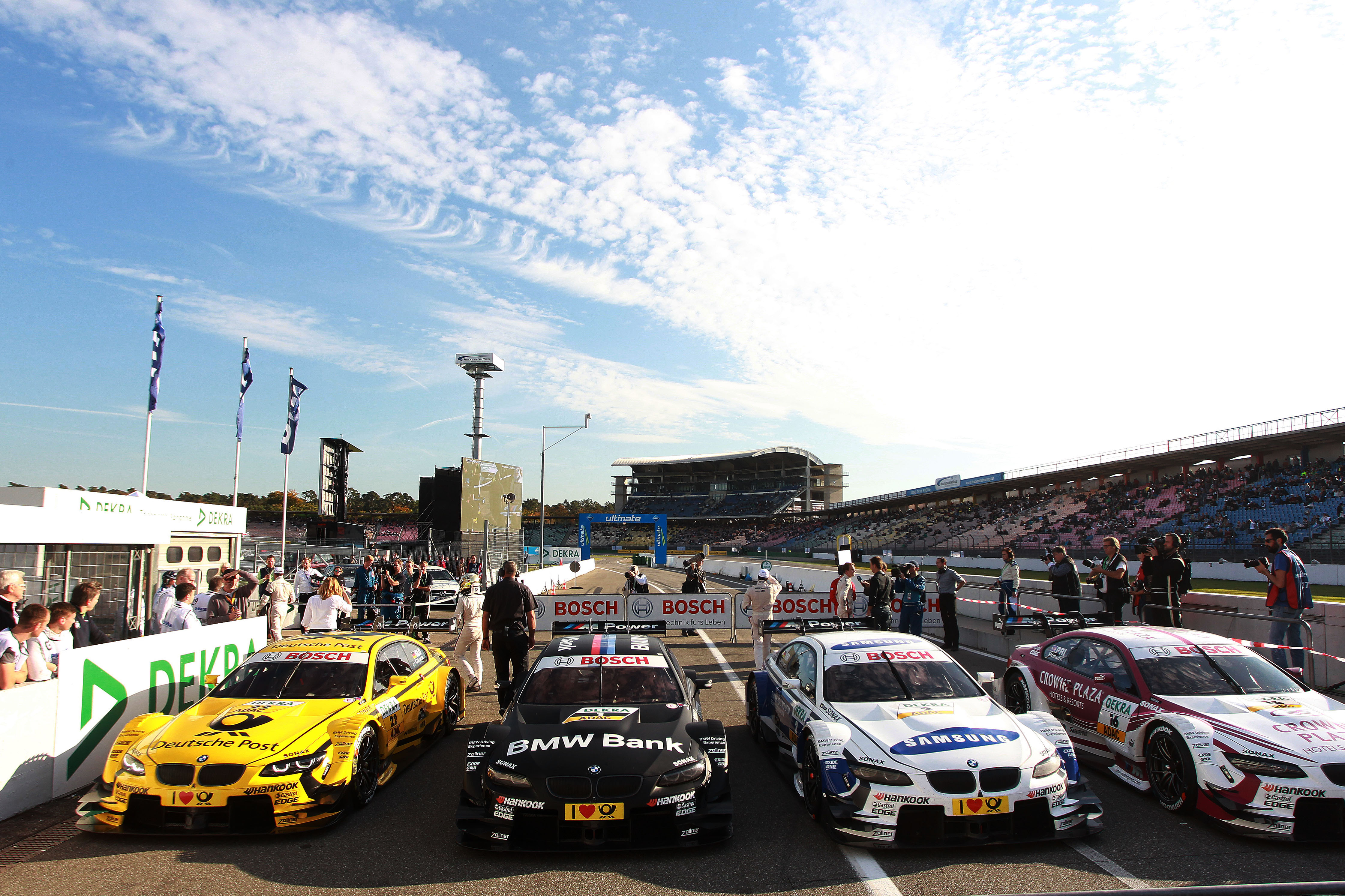 Hockenheim (DE) 19th October 2013. BMW Motorsport, DEUTSCHE POST BMW M3 DTM, BMW Bank M3 DTM, SAMSUNG BMW M3 DTM and Crowne Plaza Hotels BMW M3 DTM. This image is copyright free for editorial use © BMW AG (10/2013).