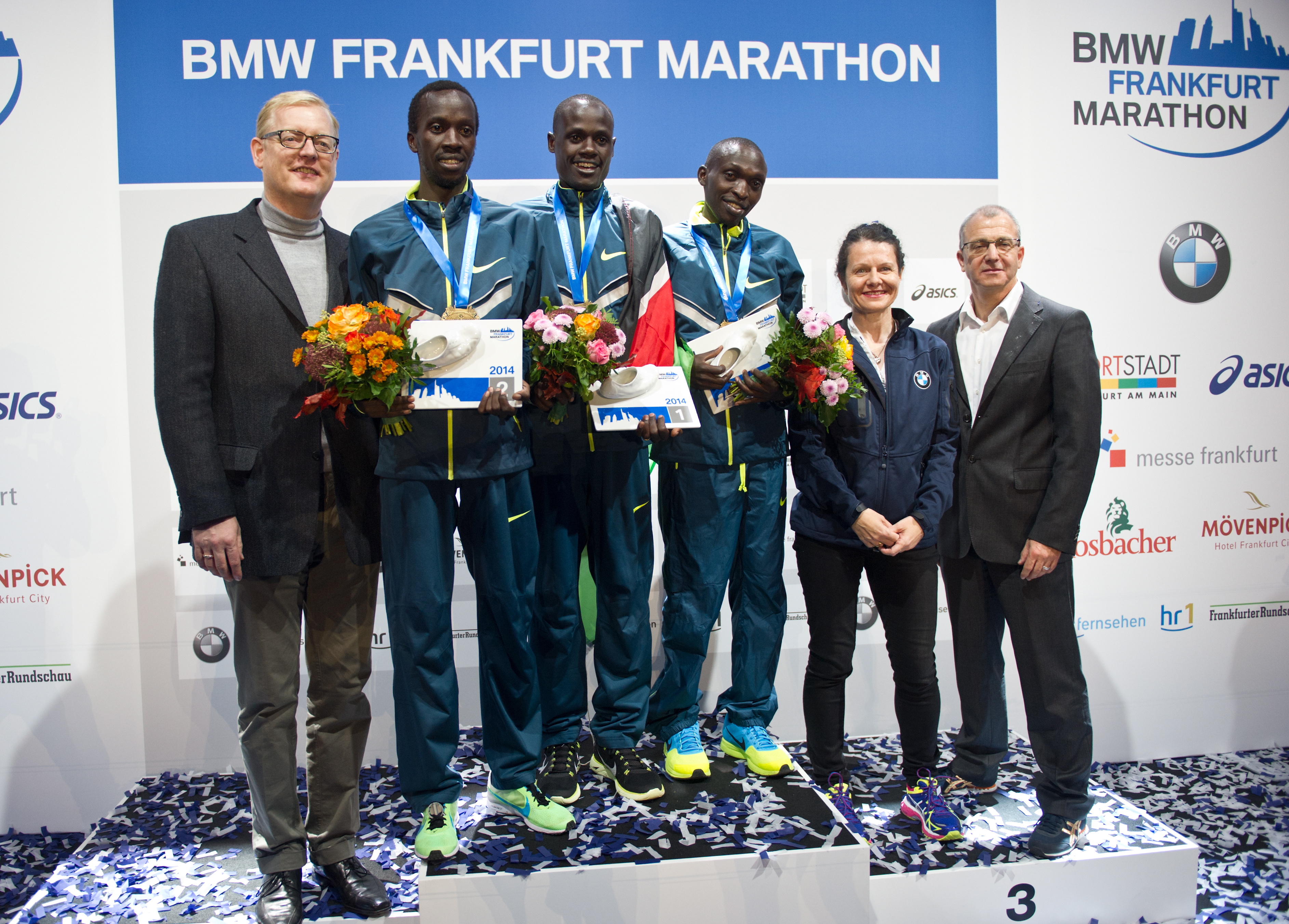 26. Oktober 2014 - BMW Frankfurt Marathon 2014 - Markus Frank, Frankfurter Sportstadtrat, Mike Kipruto Kigen, Sieger Mark Kosgei Kiptoo, Gilbert Kollum Yegon, Stefanie Wurst, Leiterin Marketing BMW Deutschland, Jo Schindler, Race-Direktor © BMW AG (10/2014).