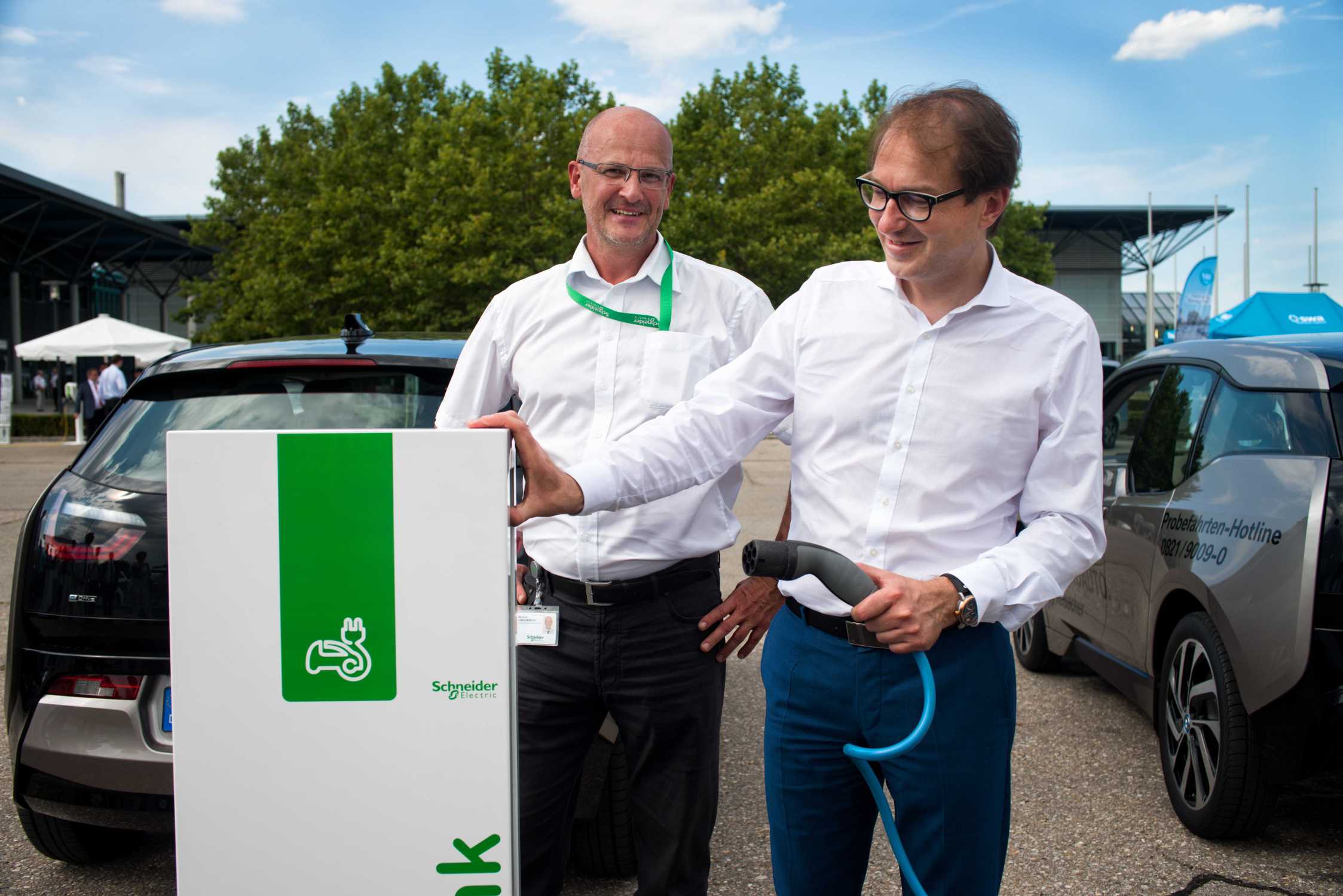 Bundesminister für Verkehr und digitale Infrastruktur Alexander Dobrindt (rechts) und Manfred Lang-Henrich, Schneider Elektric, im Rahmen des Minister ...