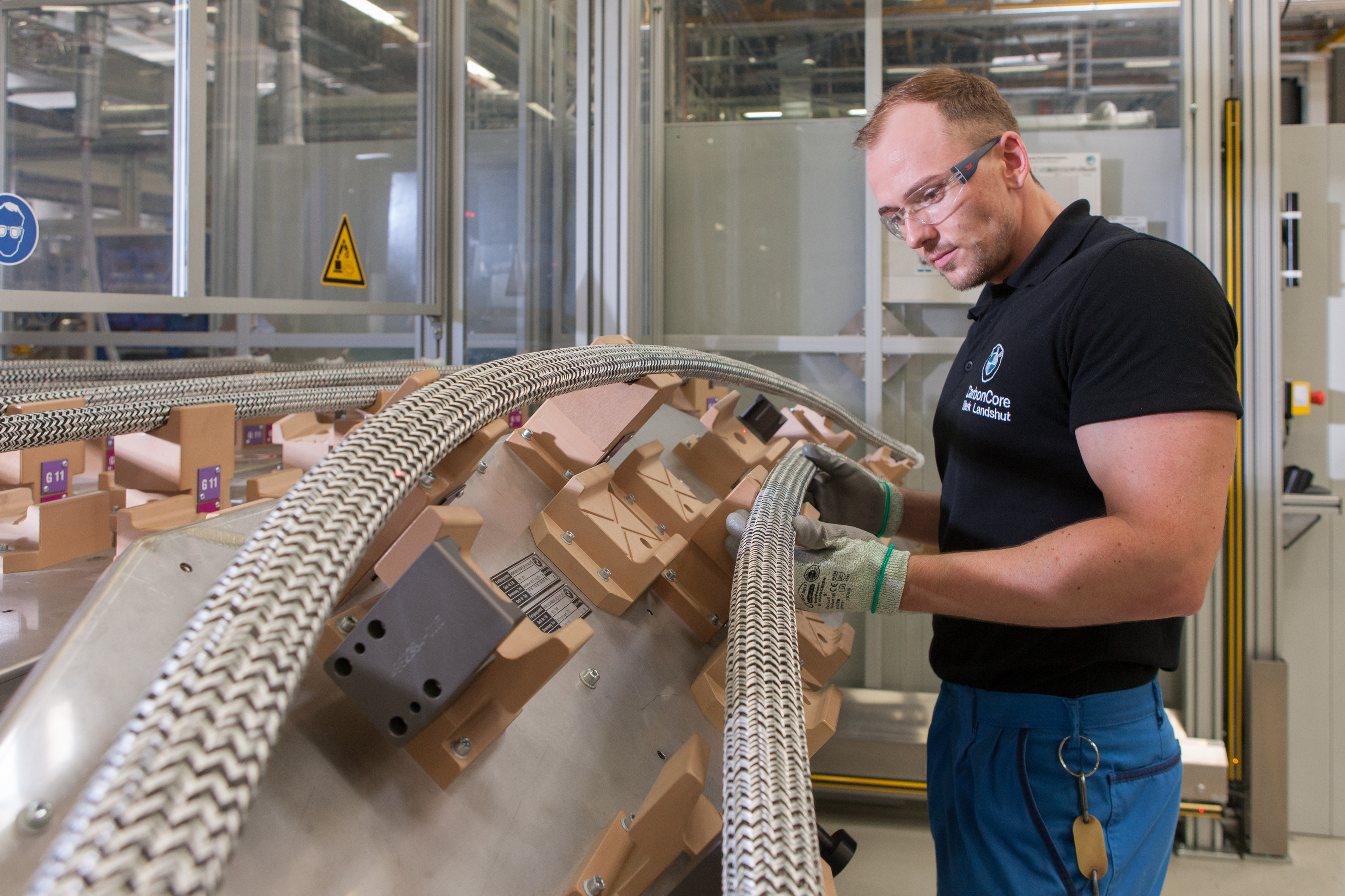 Ein Mitarbeiter legt einen geflochtenen Dachrahmen in die RTM-Presse zur Harz-Injektion ein. (09/2015)