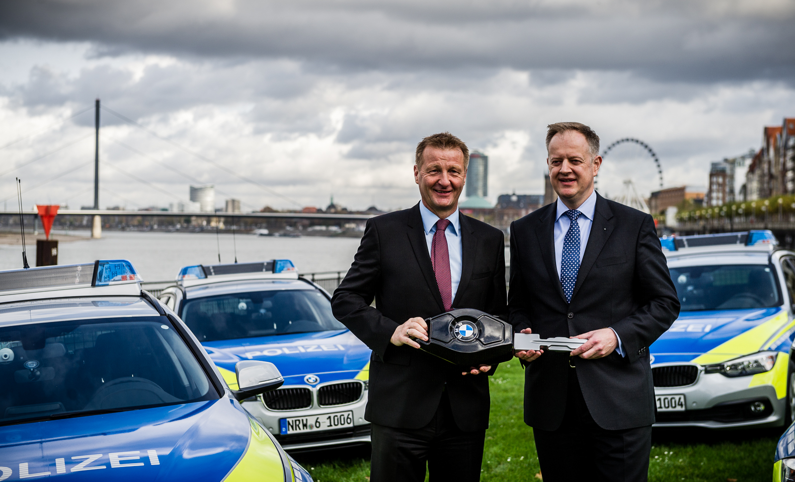 Ralf Jäger, Innenminister von Nordrhein-Westfalen, nimmt die ersten zwölf BMW 318d Touring von Alexander Thorwirth, Leiter Vertrieb an Direkt- und Sonderkunden BMW Deutschland, am Rheinufer in Düsseldorf in Empfang (v.l.n.r.) (11/2015)