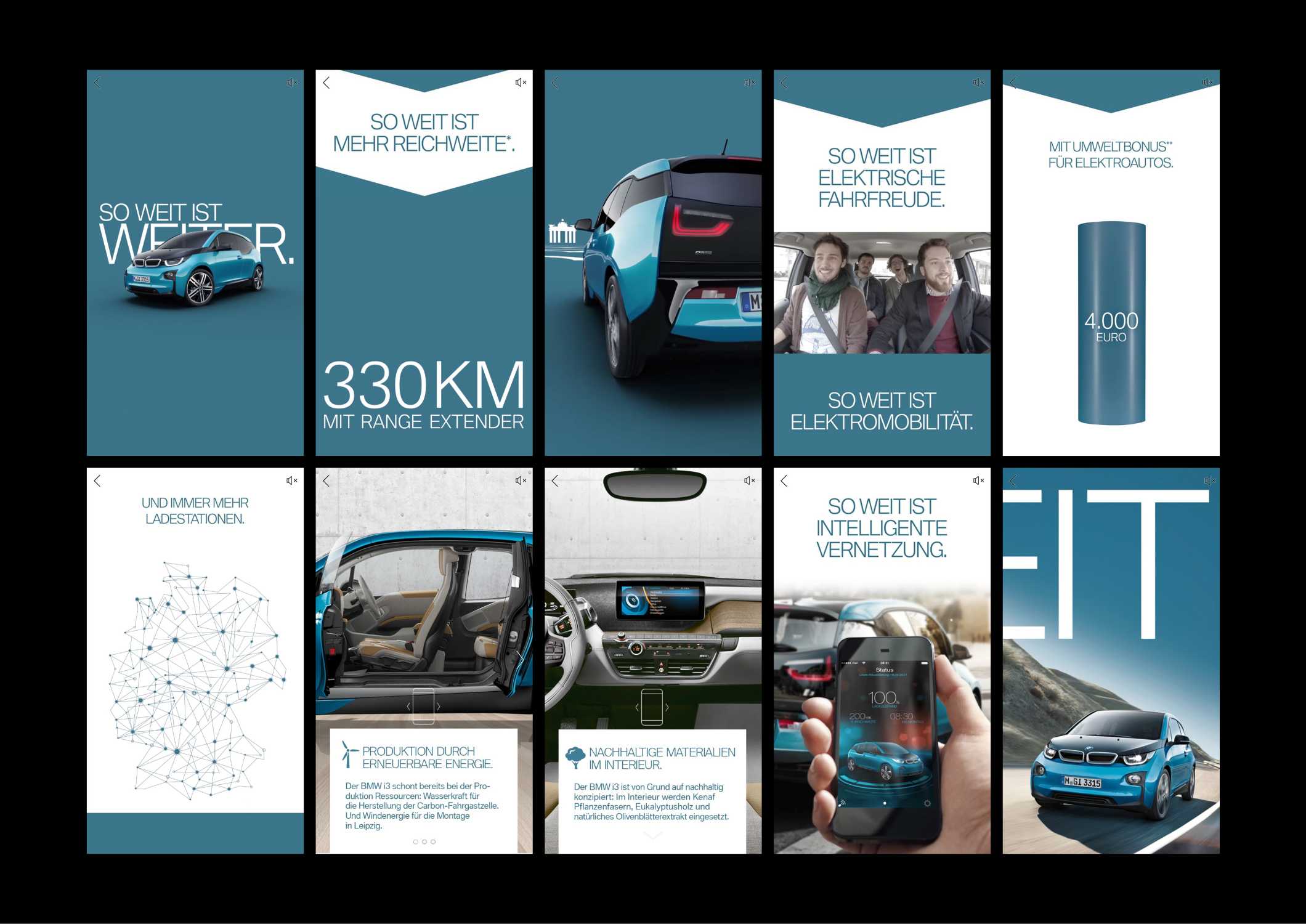 Die "Canvas-Ad“ platziert neben Informationen zur Reichweite und dem Umweltbonus auch Informationen zum staatlichen Ausbau der Ladeinfrastruktur und dem ganzheitlichen Nachhaltigkeitsansatz des BMW i3. (07/2016)