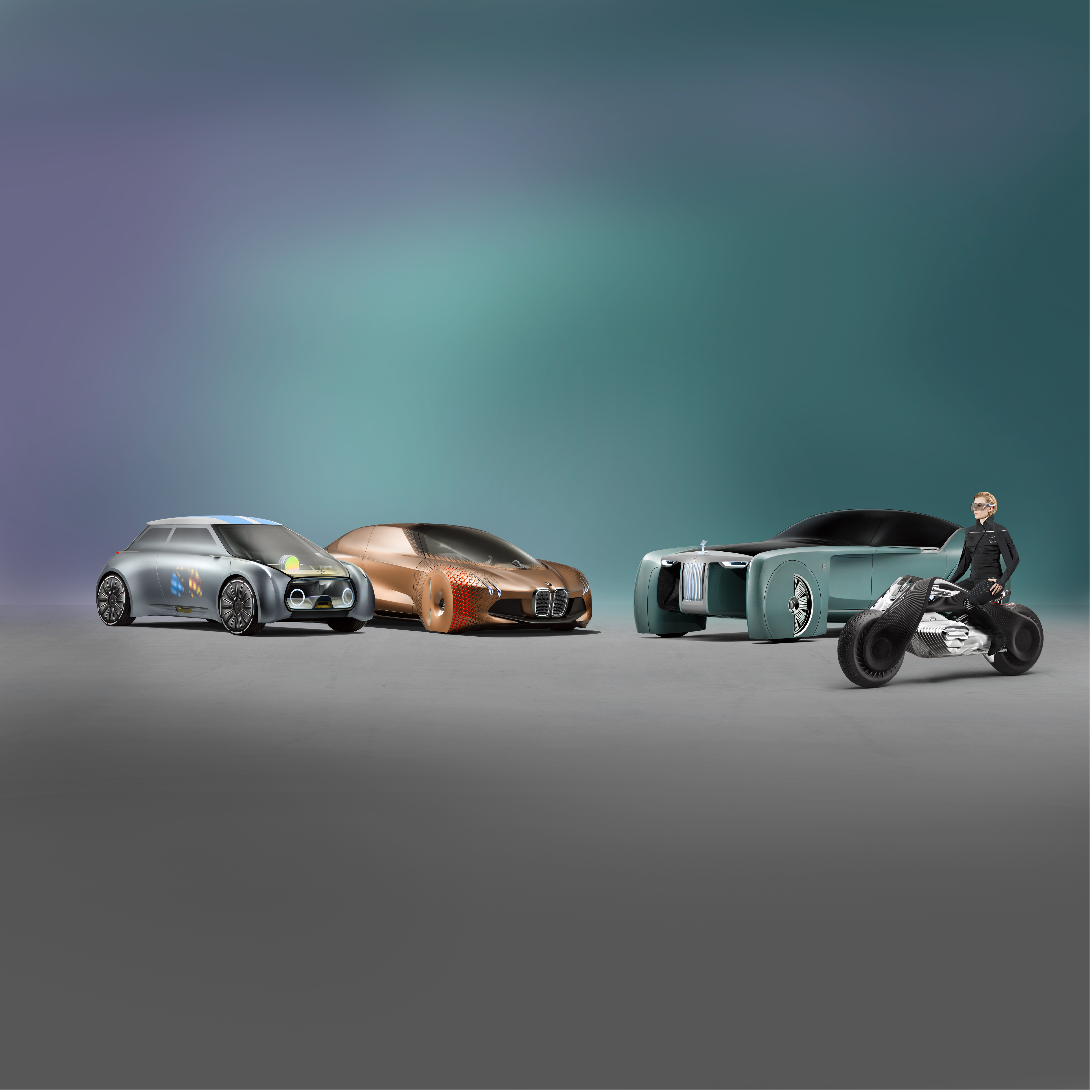 MINI VISION NEXT 100, BMW VISION NEXT 100, Rolls-Royce VISION NEXT 100, BMW Motorrad VISION NEXT 100 (v.l.r.) (10/2016)
