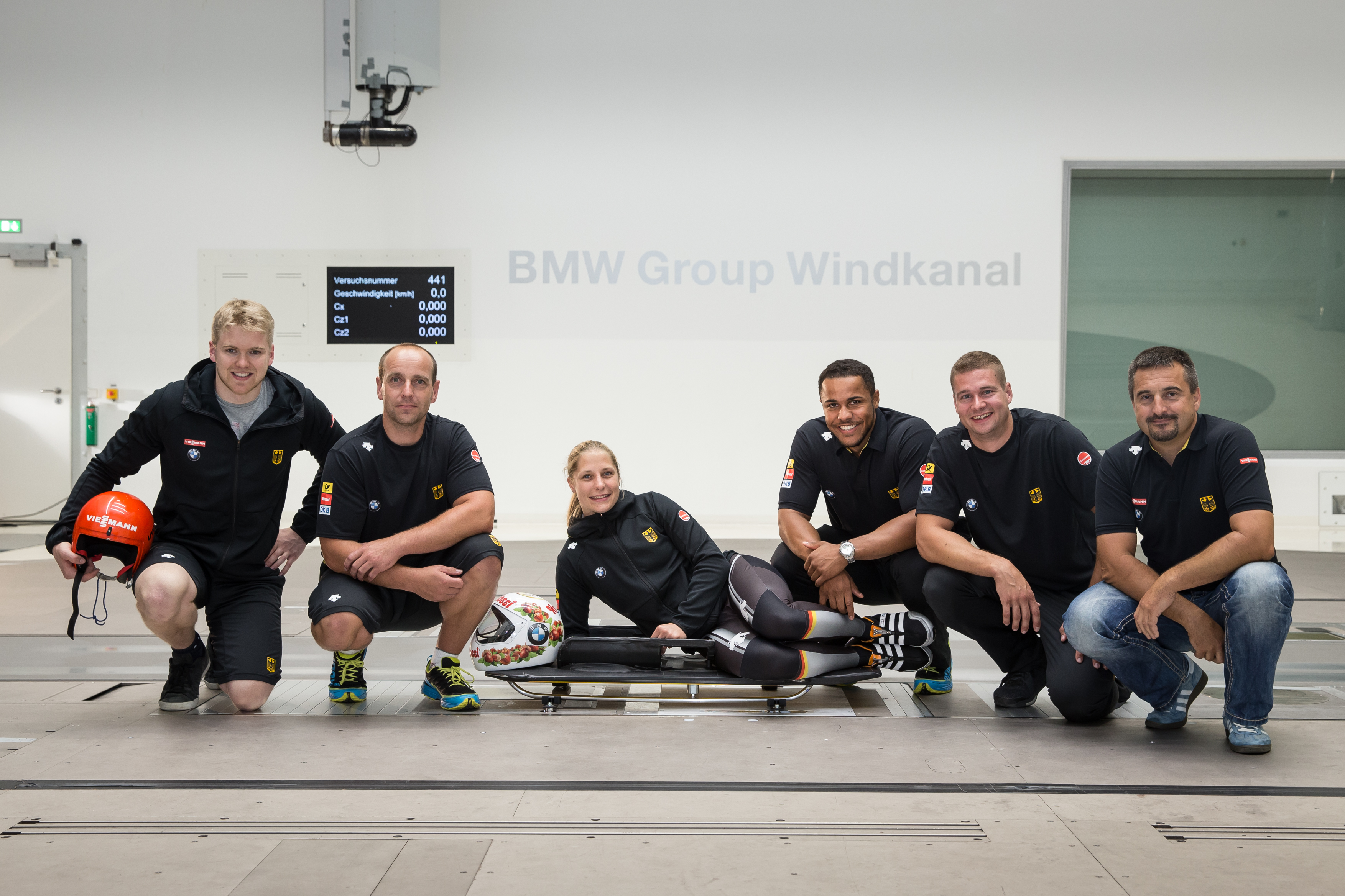 BMW Group Windkanal. Aerodynanik-Tests des Bob- und Schlittenverbands für Deutschland. Julian von Schleinitz (Rennrodlen), Dirk Matschenz (Skeleton-Trainer), Tina Hermann (Skeleton), Joshua Blum (Bob), Johannes Lochner (Bob), Georg Hackl (Rodeltrainer).