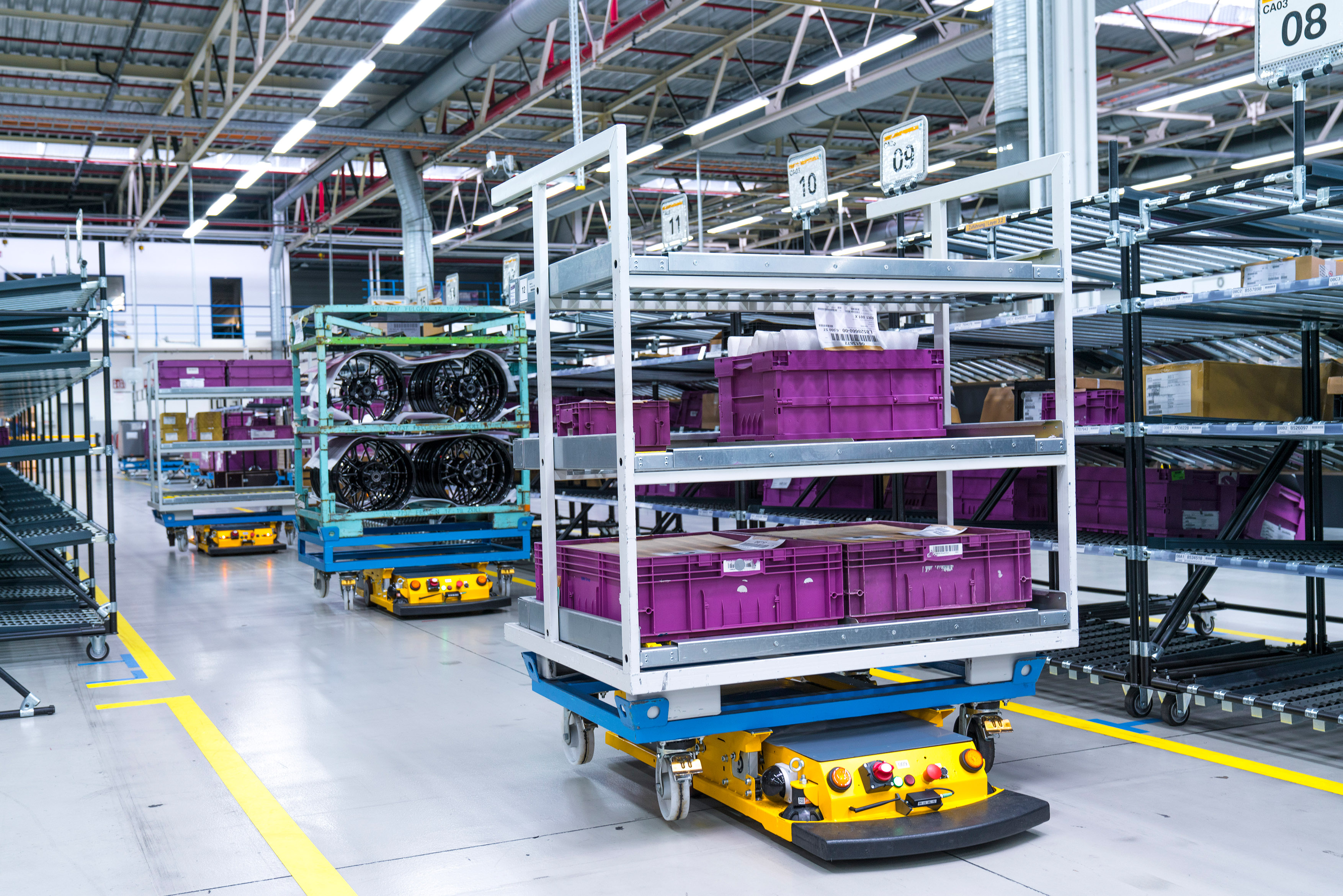 Smart Transport Roboter transportiert Rollcontainer durch Logistikhalle in BMW Group Werk Wackersdorf (11/2016)