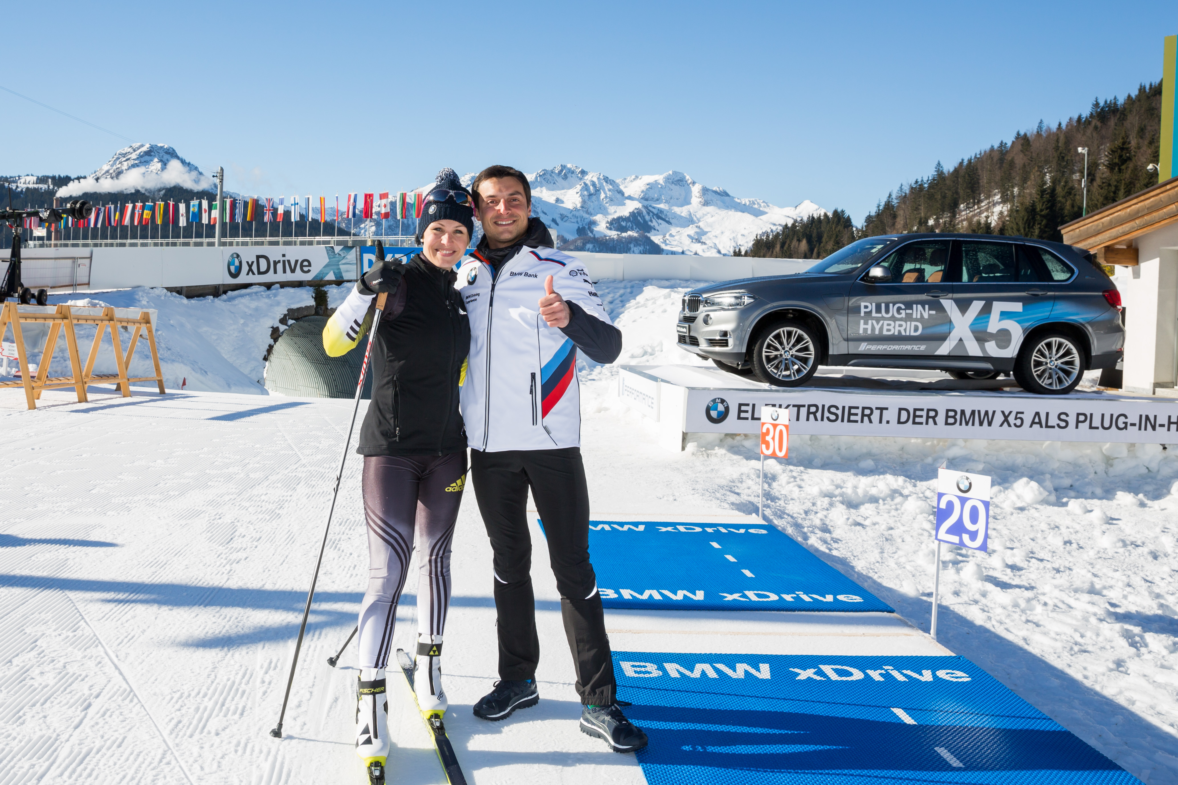 Hochfilzen (AUT), 15. Februar 2017. IBU Weltmeisterschaften Biathlon 2017. Magdalena Neuner (GER), Bruno Spengler (CAN).