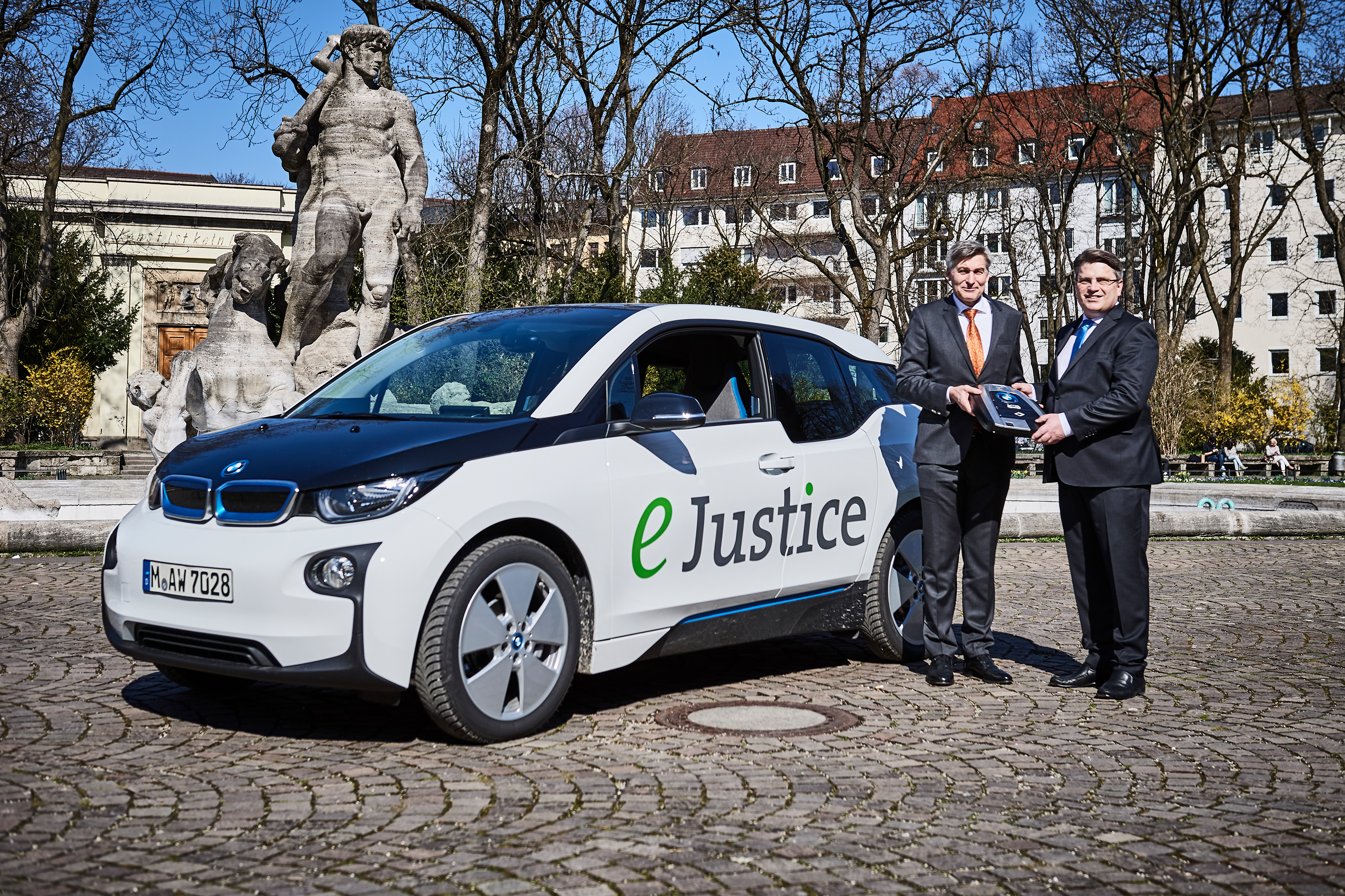 Thomas von Grossmann (l.), Leiter Vertrieb an Behörden, Einsatz-Sicherheitsfahrzeug und Sonderkunden, BMW Deutschland, überreichte dem Bayerischen Justizminister Prof. Dr. Winfried Bausback die Fahrzeugschlüssel für den neuen BMW i3 am Neptunbrunnen vor dem Justizpalast am Karlsplatz in München. (03/2017)