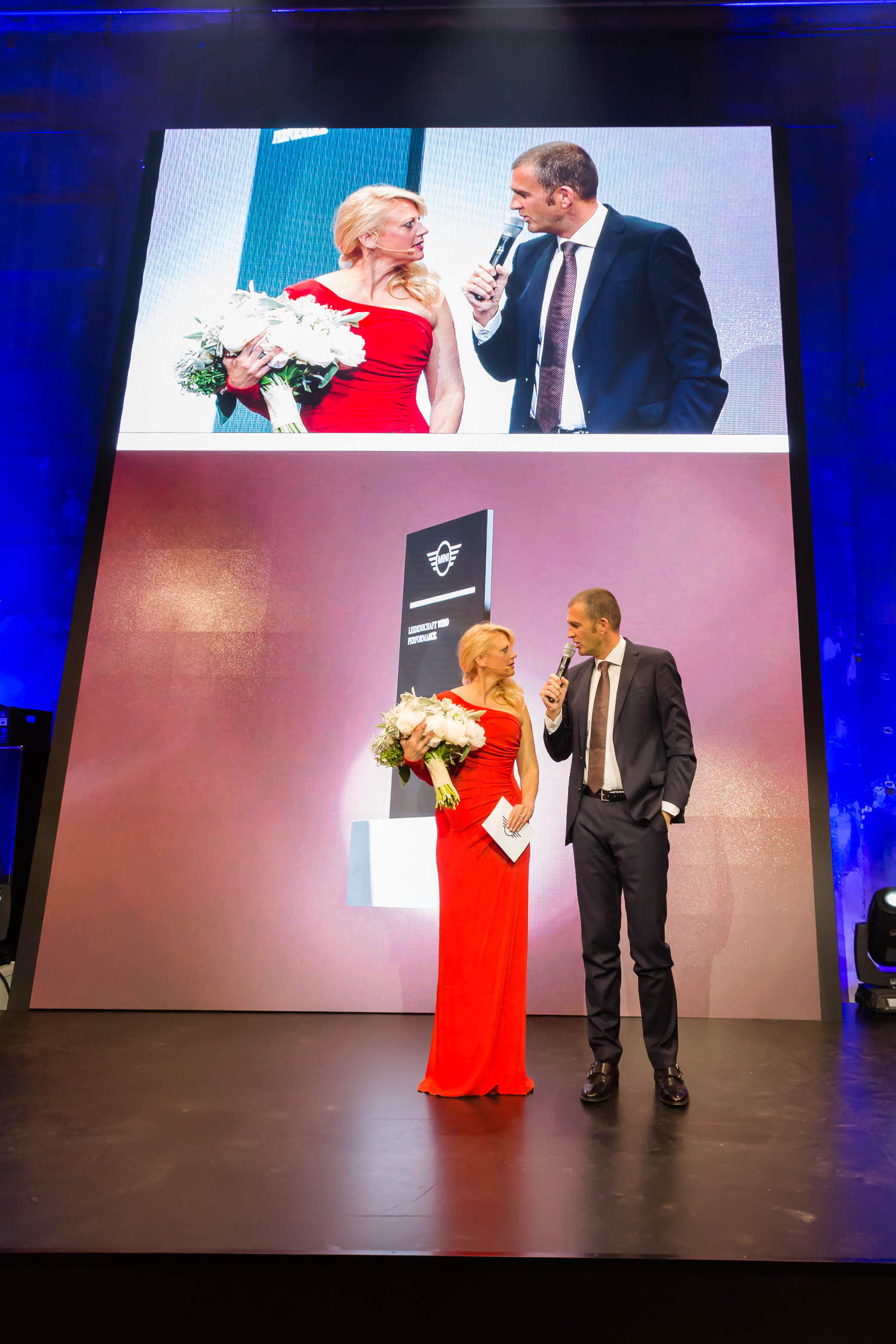 Gastgeber des Abends Christian Ach, Leiter Vertrieb MINI Deutschland, mit Moderatorin Barbara Schöneberger. Die Preisverleihung der MINI Awards 2016 am 04. Mai 2017 im Kunstkraftwerk in Leipzig. (05/2017)