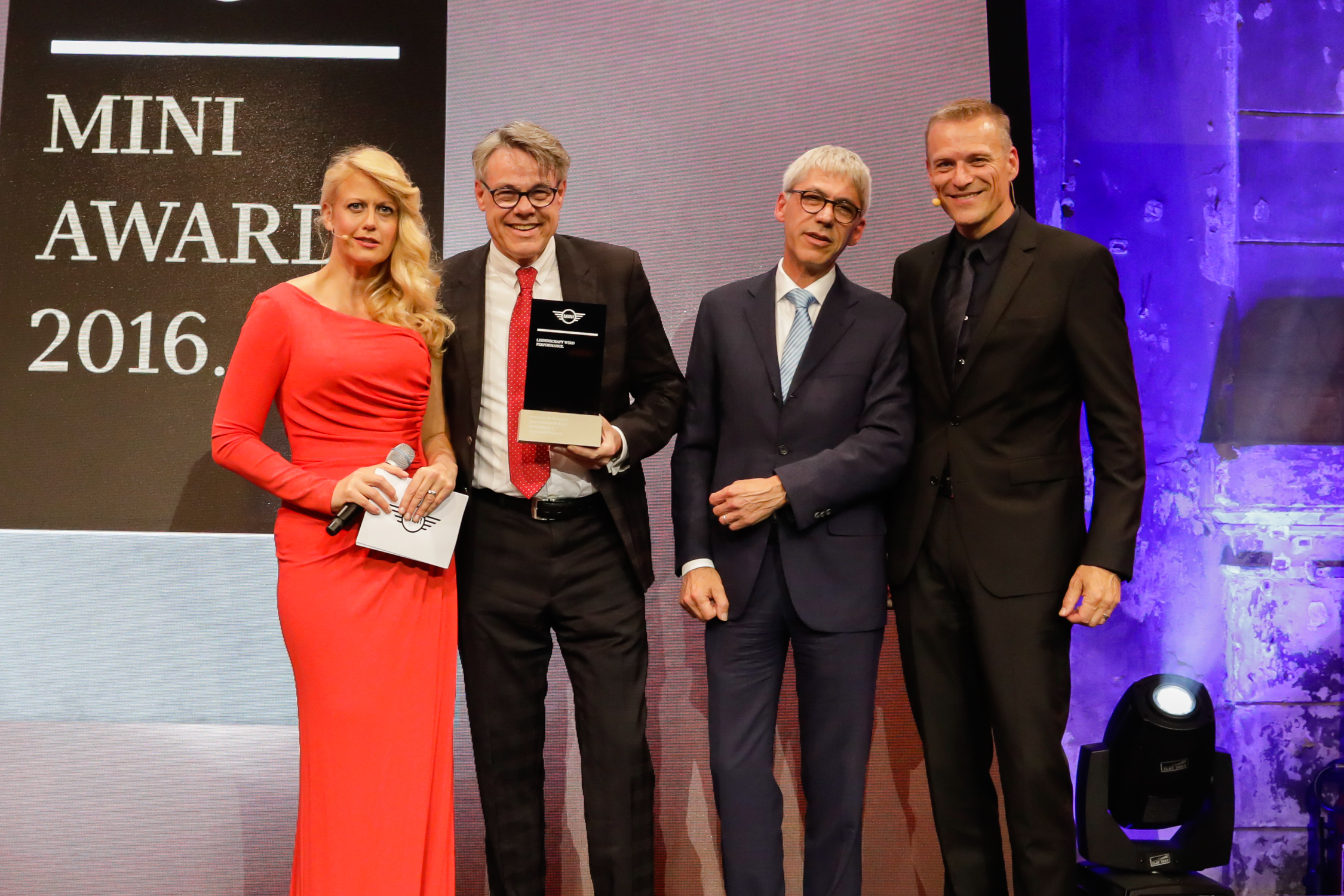 Preisträger Kategorie "Neue Automobile Retail (>299 Eh.)" - Autohaus Hakvoort. Mit Laudator Peter van Binsbergen, Leiter Vertrieb BMW Group Deutschland, und Moderatorin Barbara Schöneberger. Die Preisverleihung der MINI Awards 2016 am 04. Mai 2017 im Kunstkraftwerk in Leipzig. (05/2017)