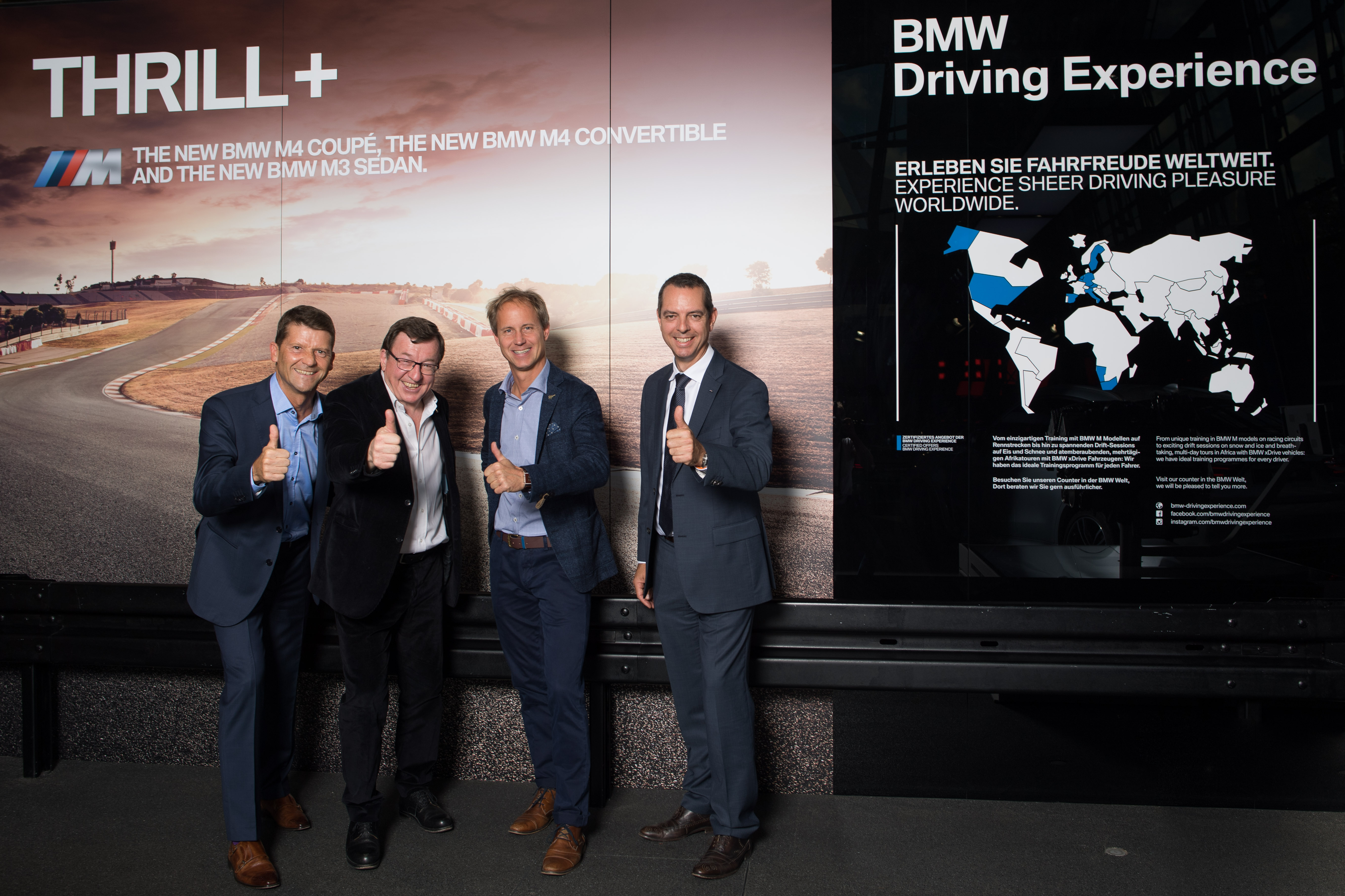 von links nach rechts: Robert Eichlinger, Jakob Falkner, Gerhard Gstettner, Frank van Meel bei der Vertragsunterzeichnung in der BMW Welt - BMW und MINI Driving Experience im Ötztal und Pitztal (09/2017).