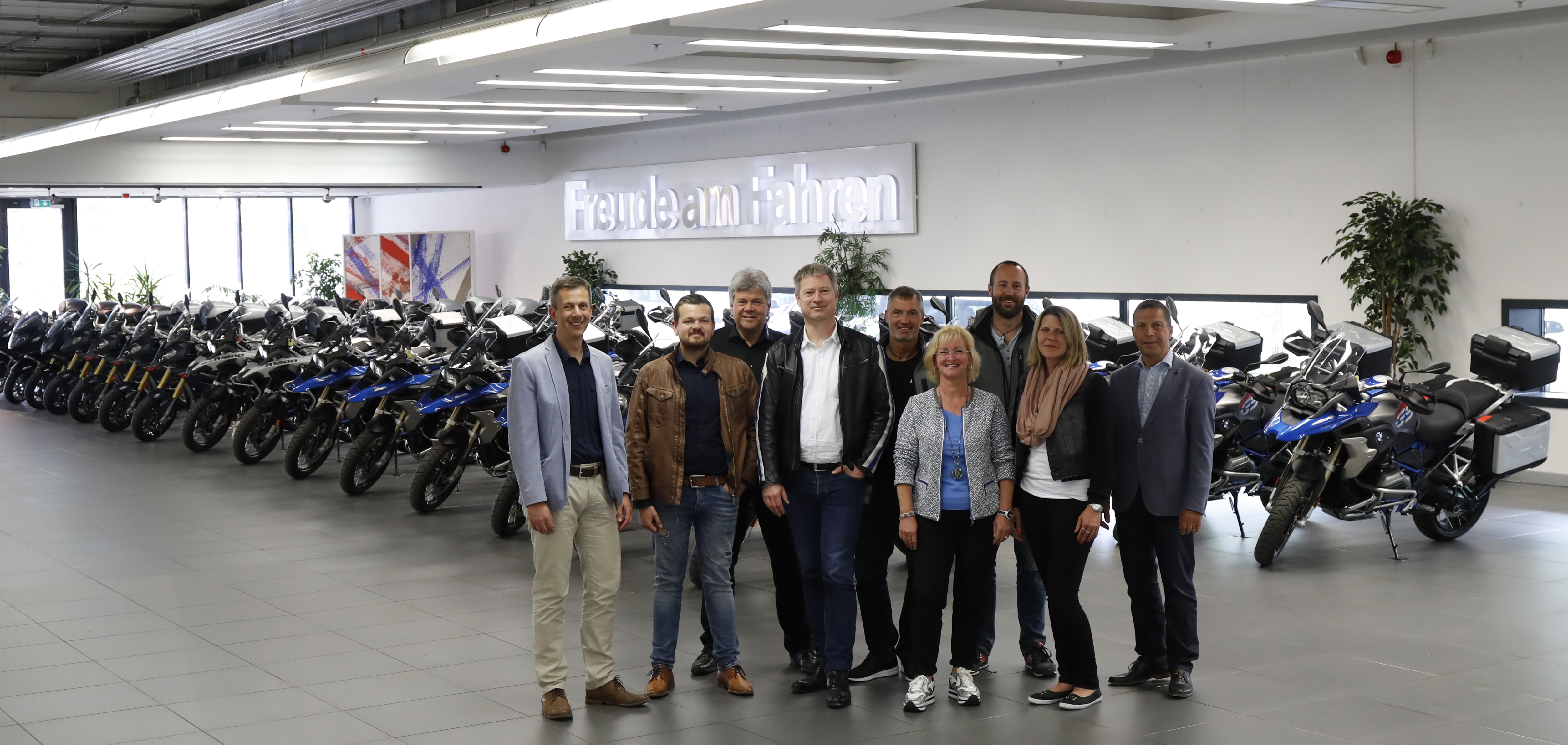 Übergabe von 36 BMW Motorrädern an die Edelweiss Bike Travel Reisegesellschaft m.b.H. am 26.04.2018 im BMW Group Kundencenter München-Freimann; von links: Rainer Buck (Geschäftsführer Edelweiss Bike Travel Reisegesellschaft m.b.H.), Patrick Martin (Erwin Martin GmbH), Georg Martin (Erwin Martin GmbH), Henning Putzke (Leiter BMW Motorrad Deutschland), Reiner Hartlehnert (BMW Motorrad Deutschland), Kornelia Martin (Erwin Martin GmbH), Markus Jäger (BMW Motorrad Deutschland), Michaela Zoller (BMW Motorrad Deutschland), Johann Braun (Leiter BMW Group Kundencenter München-Freimann) (04/2018)