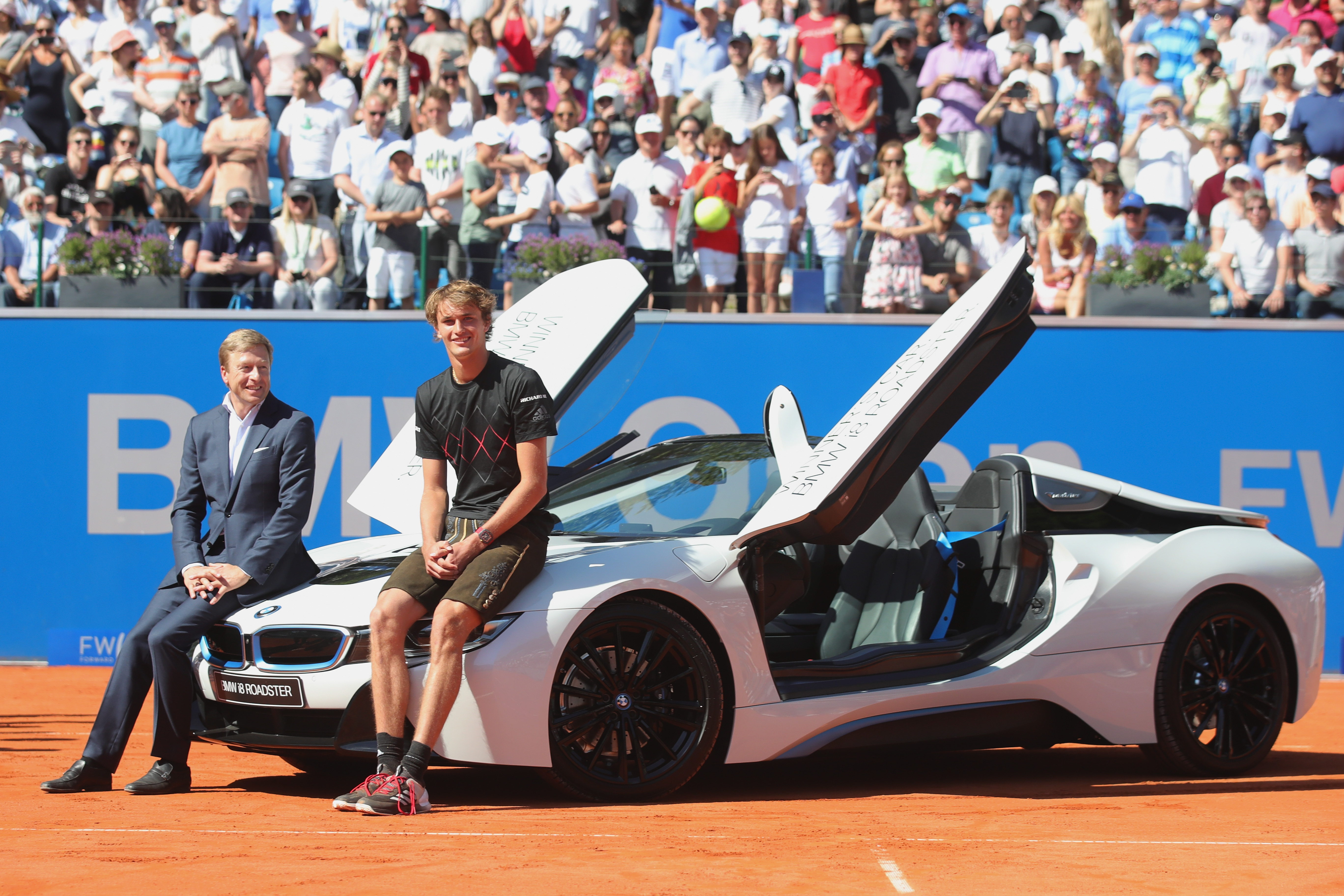 München (GER), 6. Mai 2018. BMW Open by FWU, Oliver Zipse (Mitglied des Vorstands der BMW AG), Alexander Zverev, BMW i8 Roadster.