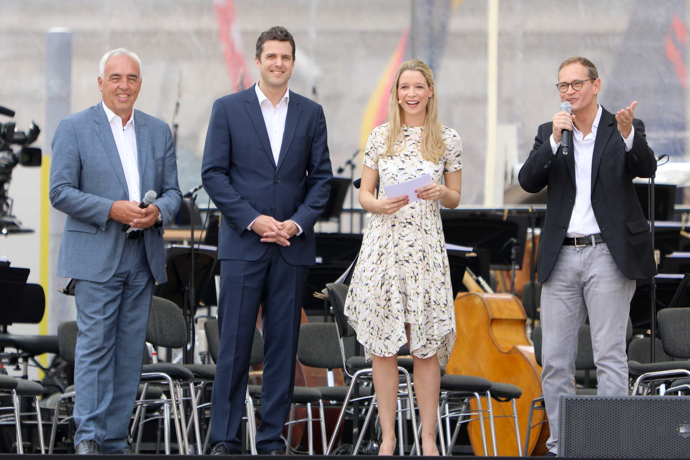 "Staatsoper für alle" dank BMW Berlin am 16. Juni 2018 mit der Staatskapelle Berlin unter der Leitung von Daniel Barenboim. Begrüßung der Gäste am 16.6.2018 durch (v.l.n.r.) Hans-Reiner Schröder, Direktor BMW Berlin; Matthias Schulz, Intendant Staatsoper Unter den Linden; Lisa Ruhfus, Moderatorin und Michael Müller, Regierender Bürgermeister von Berlin. (08/2018)