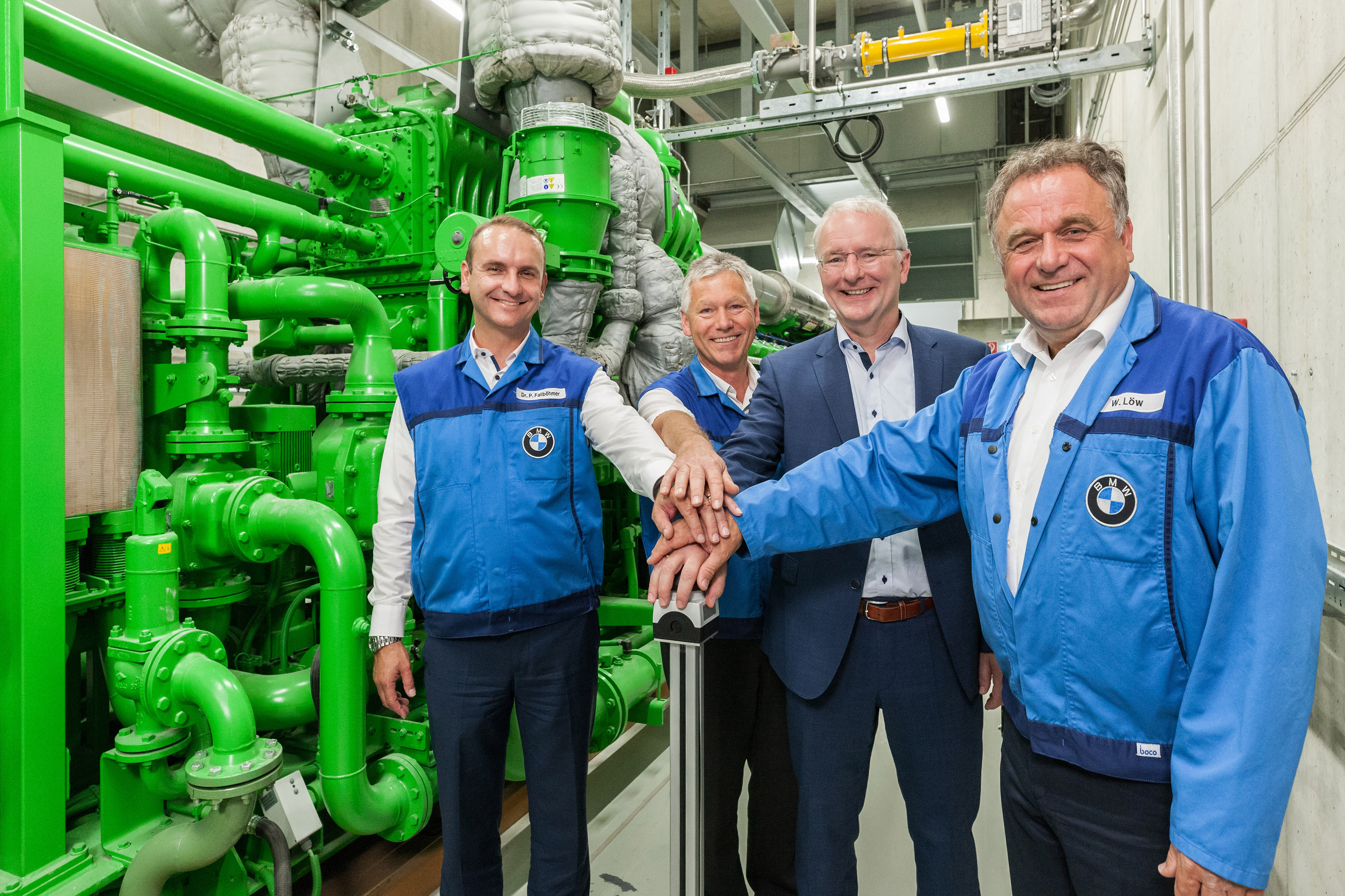Dr. Peter Fallböhmer, Leiter BMW Group Werk Landshut (l.), Willibald Löw, Betriebsratsvorsitzender BMW Group Werk Landshut (r.), Oberbürgermeister Alexander Putz (2. v. r.) und Richard Huber, Leiter Energie- und Gebäudebetrieb BMW Group Werk Landshut (2. V. l.) eröffnen feierlich die neue KWK-Anlage des BMW Group Werks Landshut. (07/2018)