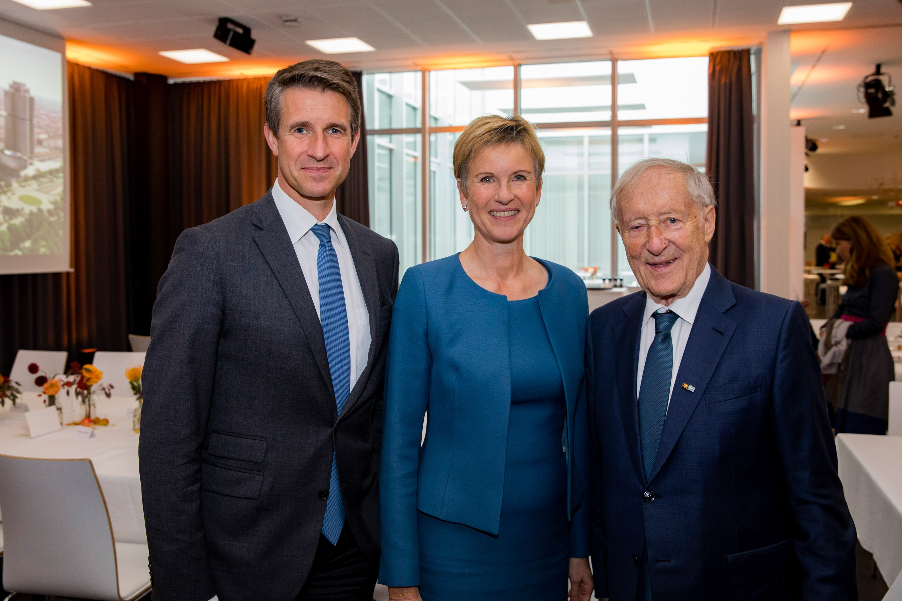 Eberhard v. Kuenheim, ehemaliger Vorstands- und Aufsichtsratsvorsitzender der BMW AG (rechts) mit Stefan Quandt und Susanne Klatten während einer Feierstunde zu seinem 90. Geburtstag im BMW Group Werk Dingolfing. (10/2018)