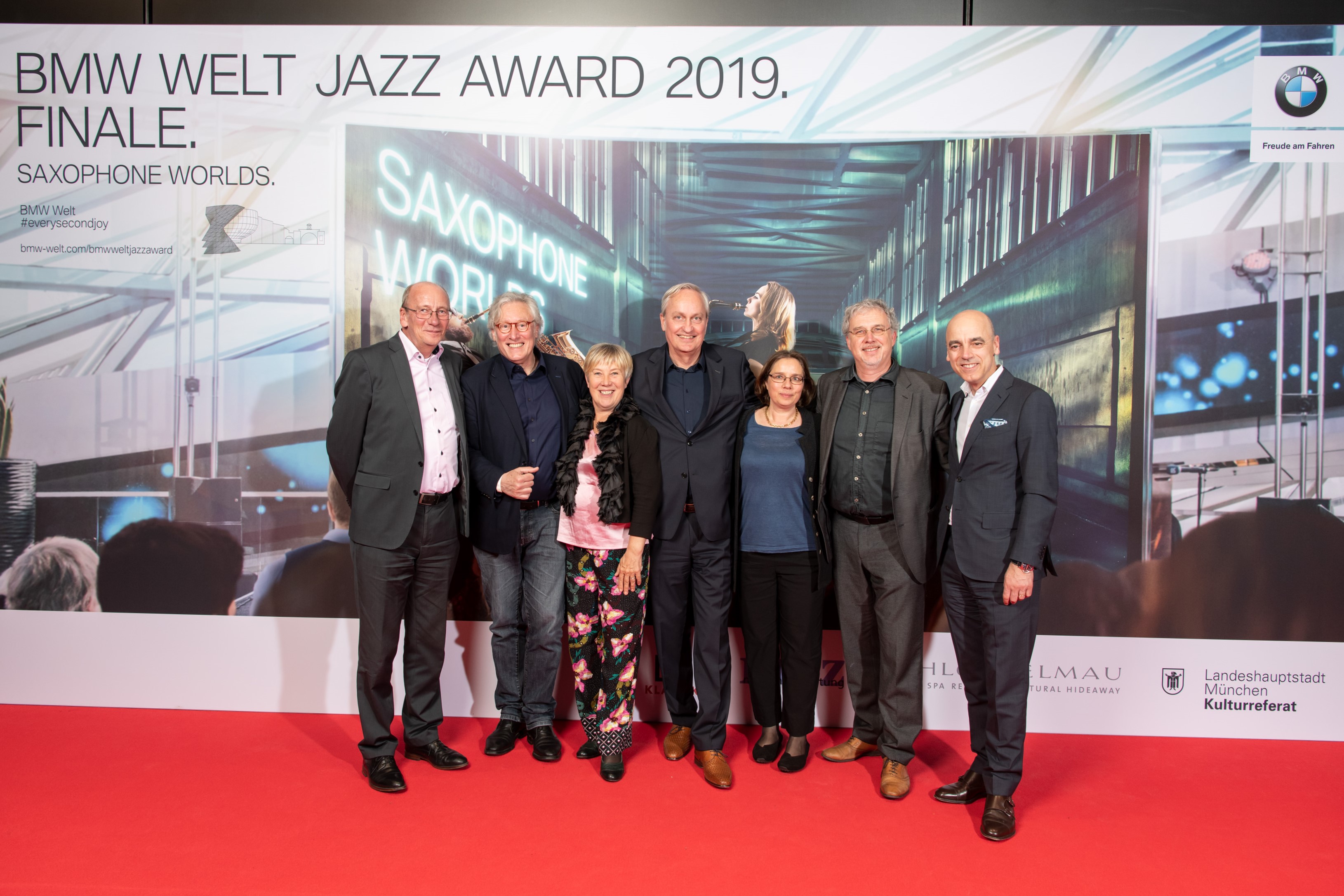 BMW Welt Jazz Award Finale 2019, v.l.n.r.: Dr. Hans-Georg Küppers (Kulturreferent der Landeshauptsadt München), Roland Spiegel (Musikredakteur mit Schwerpunkt Jazz beim Bayerischen Rundfunk, BR-KLASSIK), Christiane Böhnke-Geisse (Künstlerische Leitung Internationales Jazzfestival Bingen swingt), Oliver Hochkeppel (Musik- und Kulturjournalist der Süddeutschen Zeitung, Vorsitzender der Jury), Heike Lies (Musikwissenschaftlerin, Bereich Musik und Musiktheater, im Kulturreferat der Landeshauptstadt München), Andreas Kolb (Chefredakteur von JazzZeitung.de und neuer musikzeitung) und Dr. Nicolas Peter (Mitglied des Vorstands der BMW AG, Finanzen). (05/2019)