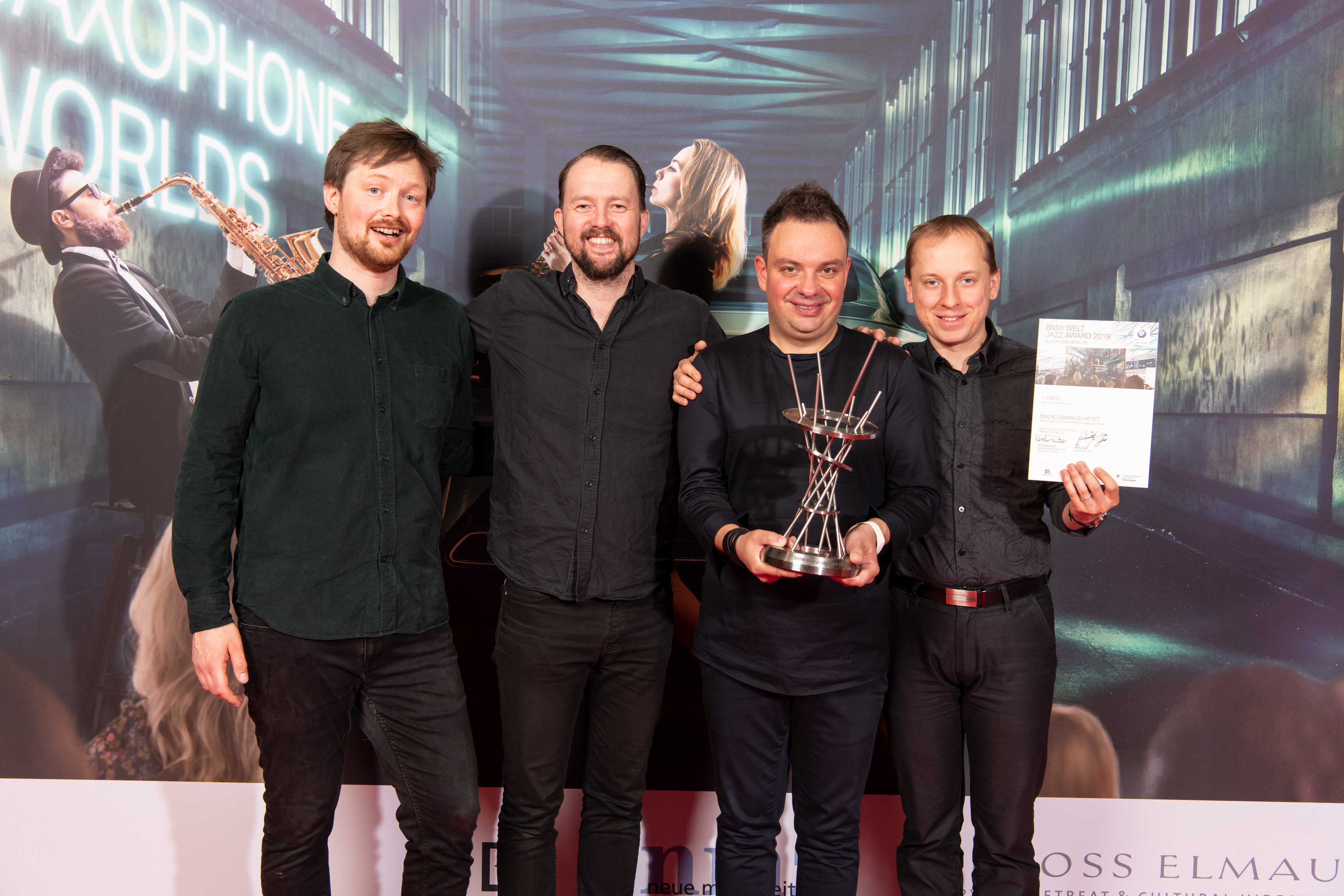 Die Gewinner des BMW Welt Jazz Award 2019: Maciej Obara Quartet, v.l.n.r.: Ole Morten Vagan (Bass), Gard Nilssen (Schlagzeug), Maciej Obara (Saxophon) und Dominik Wania (Klavier). (05/2019)