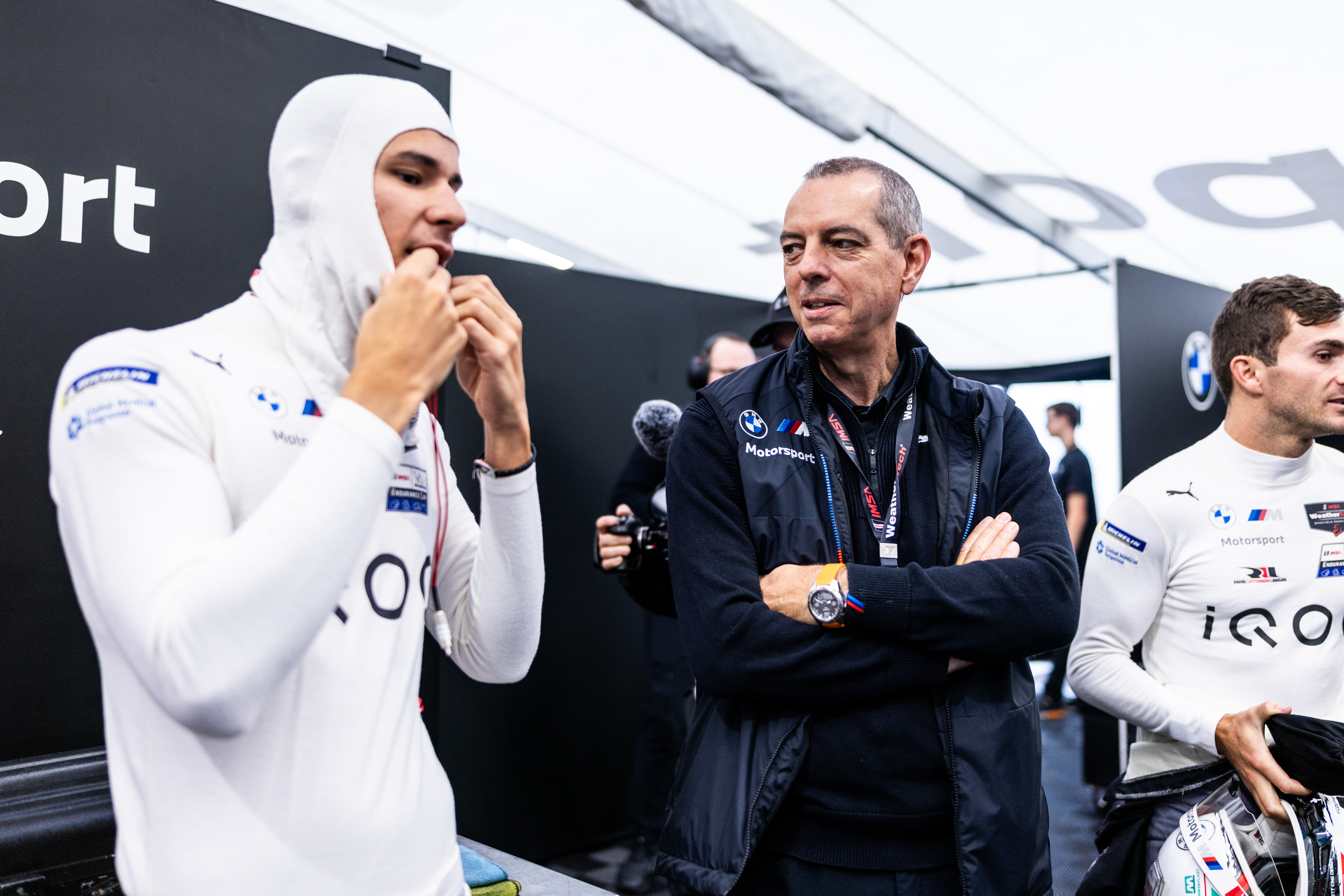 Braselton (USA), 11th to 14th October 2023. BMW M Motorsport. IMSA WeatherTech SportsCar Championship, Petit Le Mans, Road Atlanta. BMW M Team RLL, #25 BMW M Hybrid V8, Sheldon van der Linde (RSA), Connor De Phillippi (USA), Franciscus van Meel, CEO of BMW M GmbH.