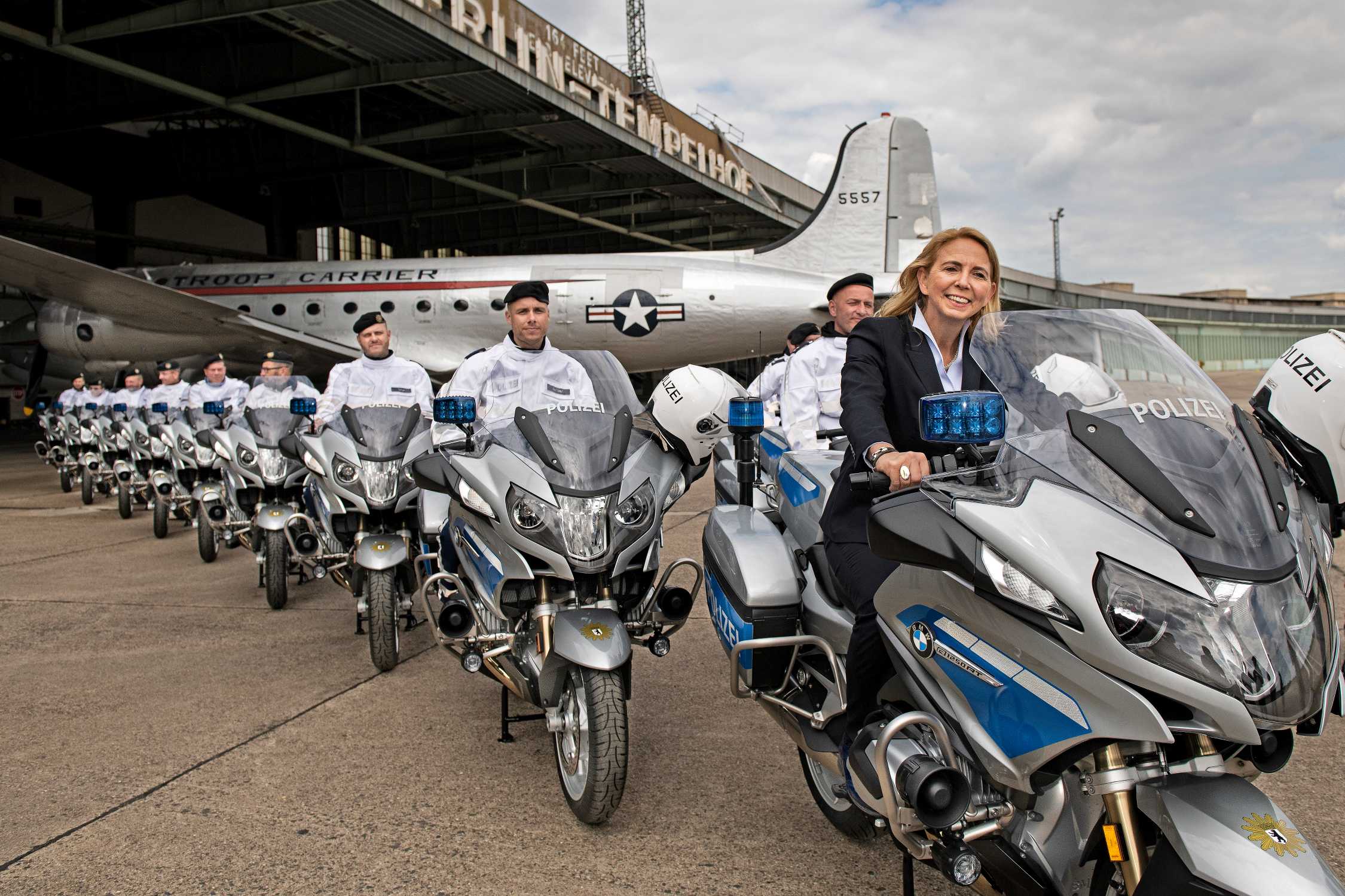 BMW Motorrad übergibt auf dem ehemaligen Flughafen Berlin-Tempelhof neue Behördenmaschinen an die Berliner Polizei. Foto: Polizeipräsidentin Barbara ...