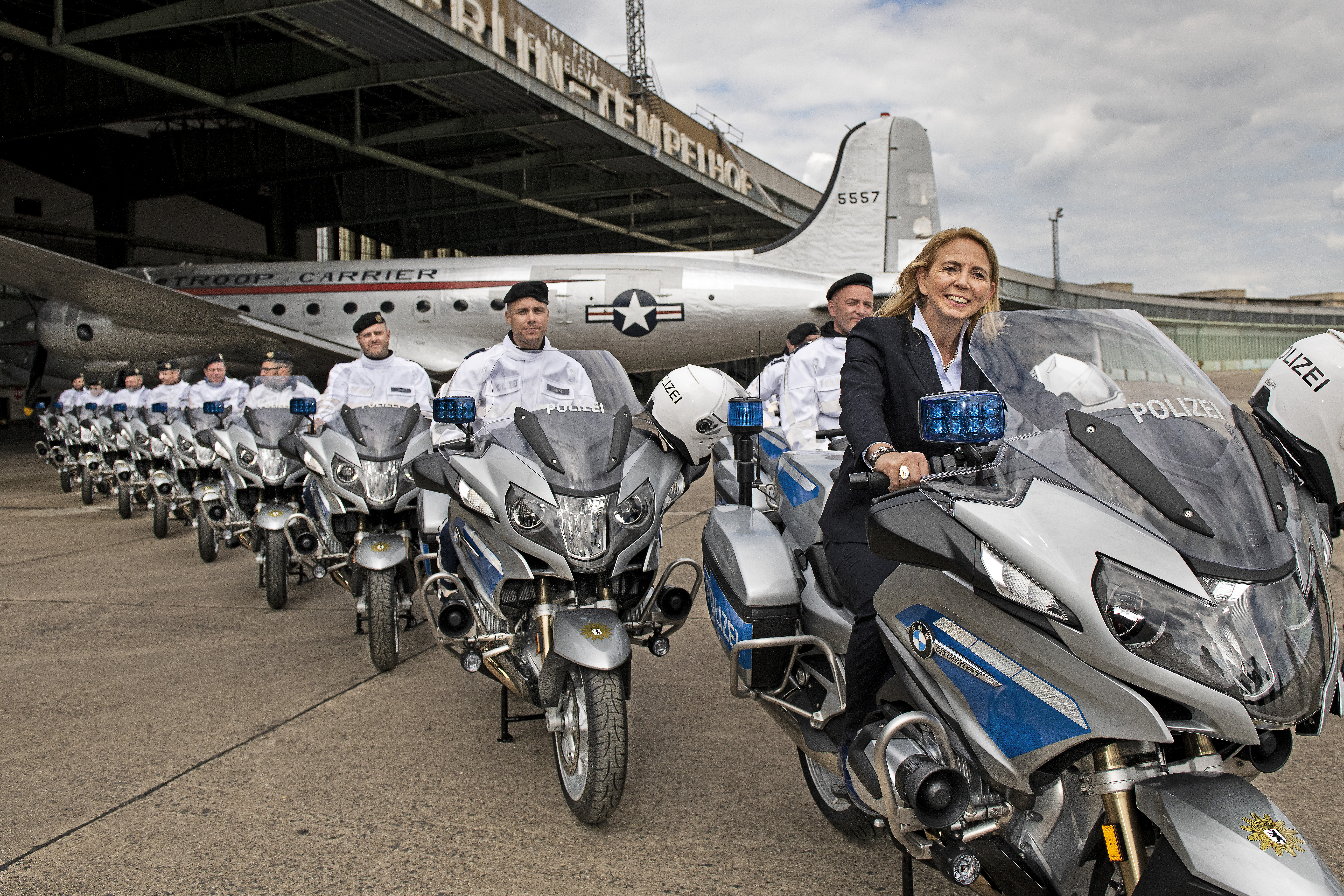 BMW Motorrad übergibt auf dem ehemaligen Flughafen Berlin-Tempelhof neue Behördenmaschinen an die Berliner Polizei. Foto: Polizeipräsidentin Barbara Slowik mit der Motorradstaffel der Berliner Polizei (05/2020)