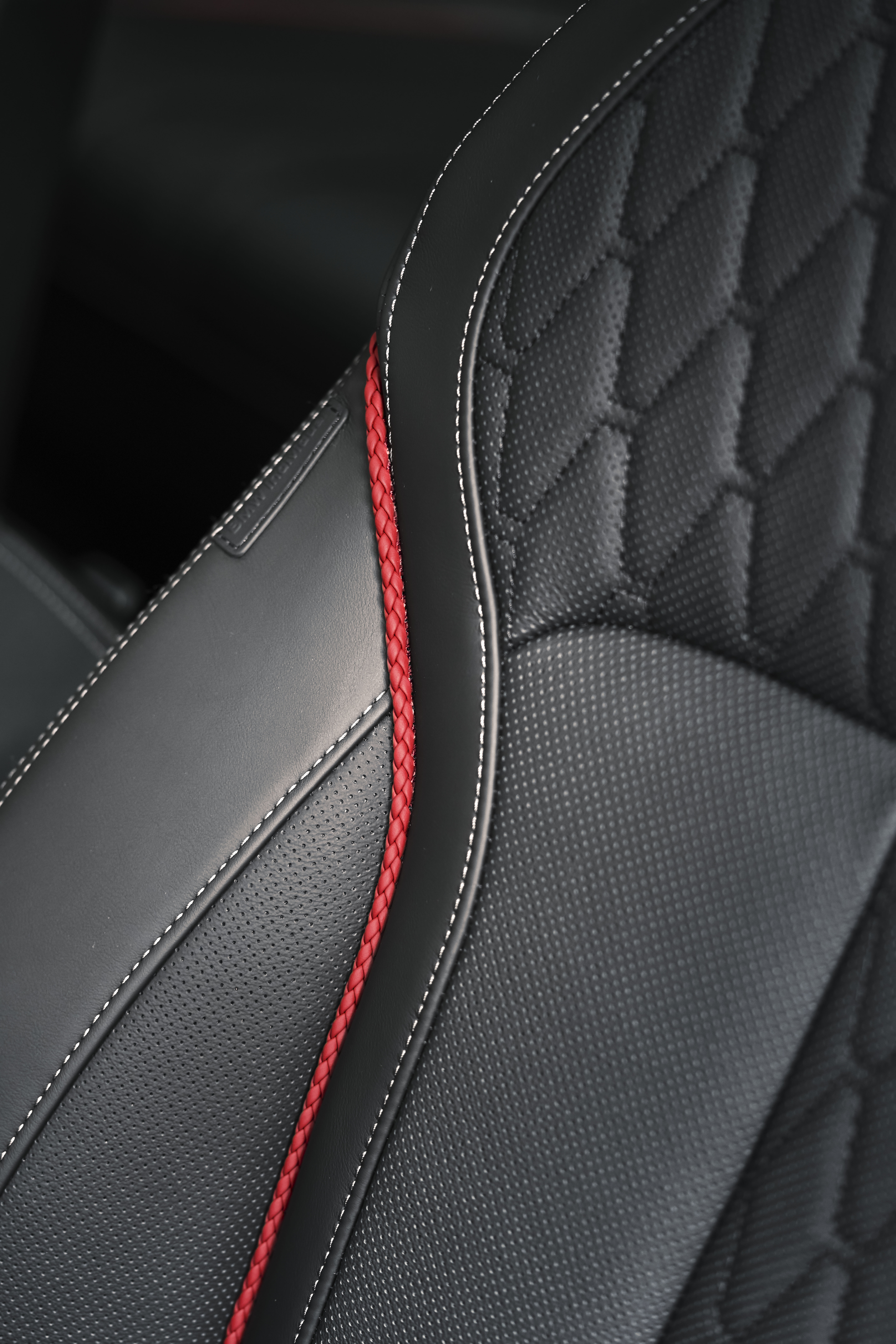 BMW X5 und BMW X6 Edition Black Vermilion, BMW Individual Volllederausstattung Merino Schwarz mit editions-spezifischen roten Ziernähten (07/2021).