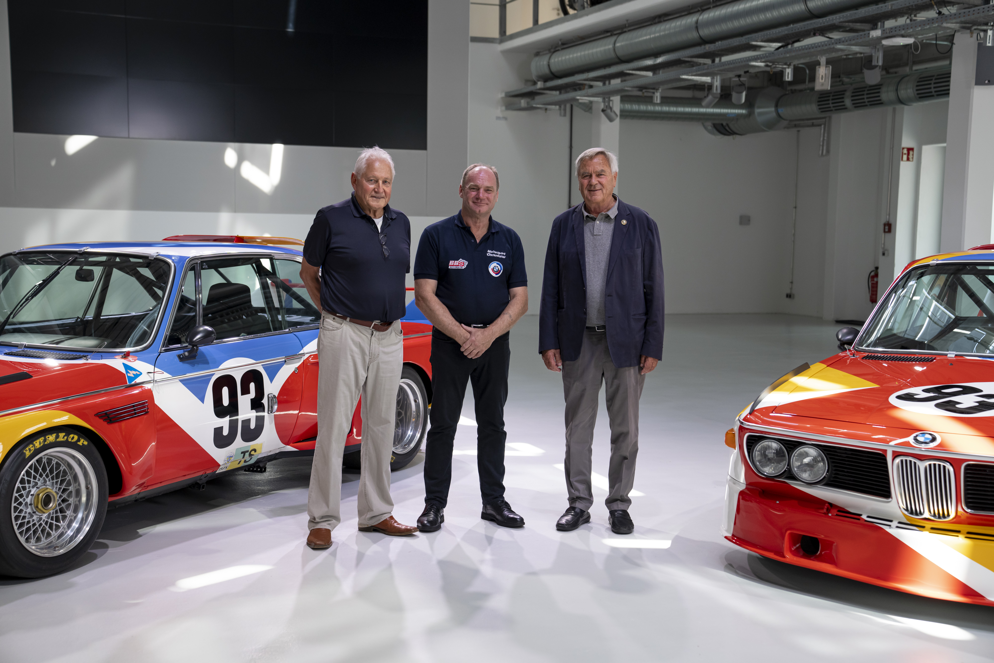 Enthüllung des Calder BMW Art Car (Artist’s Proof), 1975 / 2021 (rechts), in der BMW Group Classic am 12. August 2021: Walter Maurer (Künstler und Lackierspezialist), Franz Ostermaier (Historischer Rennsport Landshut) und Jochen Neerpasch (ehemaliger BMW Motorsport Direktor und Unterstützer der BMW Art Car Collection) mit dem Calder BMW Art Car, 1975 (links). © 2021 Calder Foundation, New York / Artists Rights Society (ARS), New York. Foto: Enes Kucevic. © BMW AG (08/2021