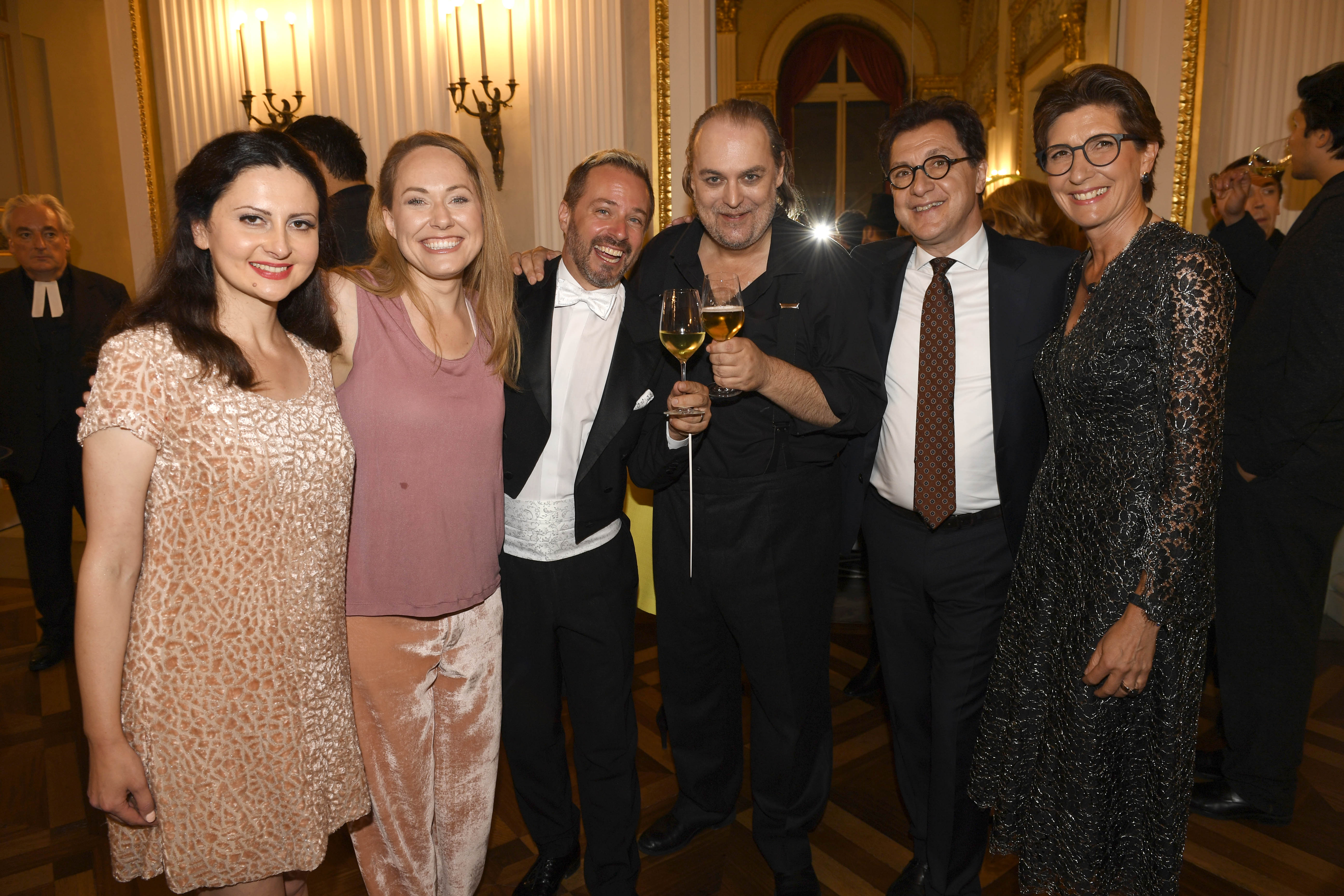 BMW und die Bayerische Staatsoper laden ein zu Oper für alle 2022 am 16. Juli auf dem Max-Joseph-Platz in München: (v.l.n.r.) Elena Tsallagova, Angela Brower, Robert Jindra, Wolfgang Koch, Serge Dorny (Intendant der Bayerischen Staatsoper), Ilka Horstmeier (Mitglied des Vorstands der BMW AG, Personal und Immobilien, Arbeitsdirektorin). Foto: Michael Tinnefeld. (07/2022)