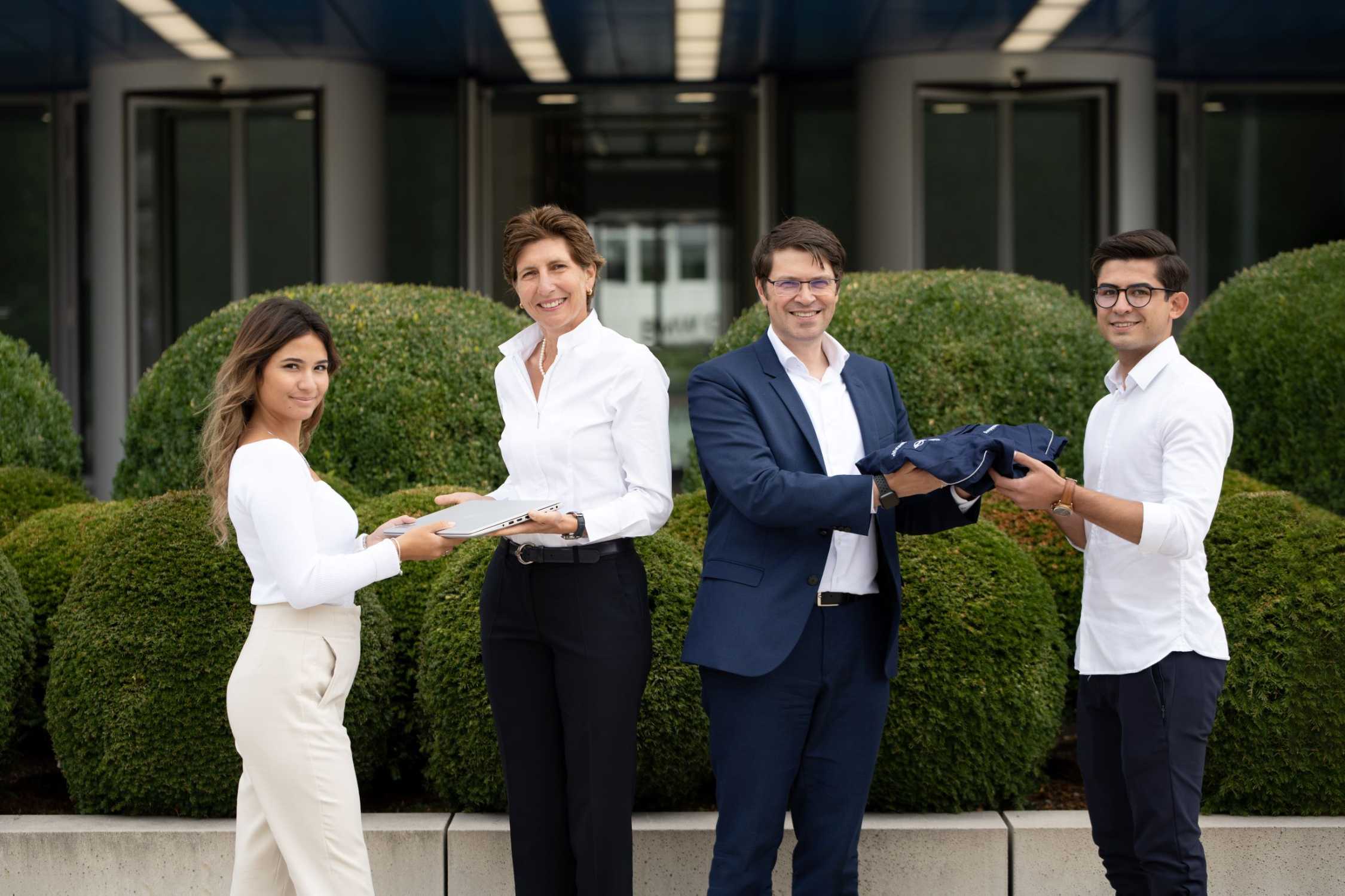Ilka Horstmeier und Dr. Martin Kimmich mit den neuen Auszubildenden Saman Salari und Meltem Sarikuzu (08/2022)