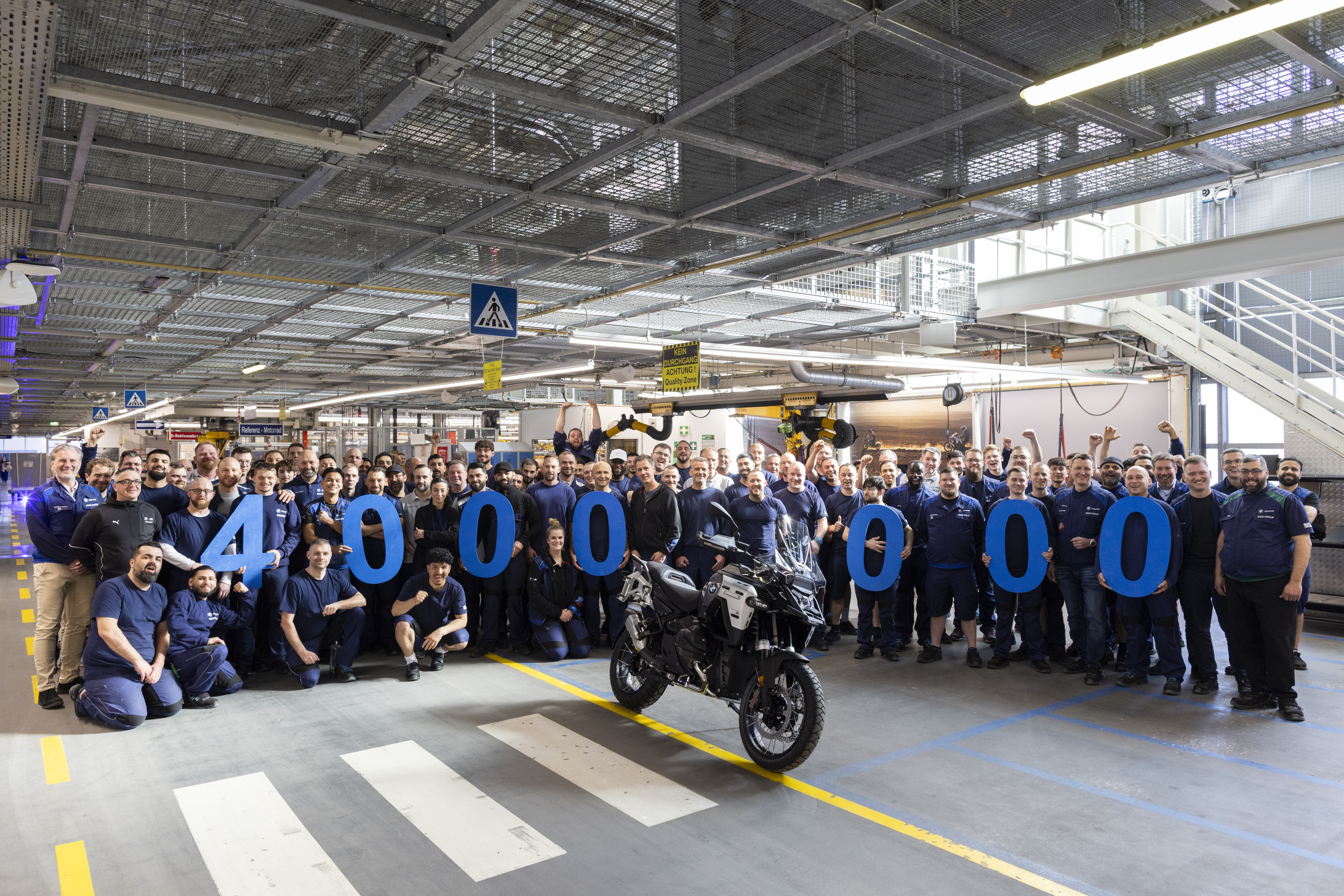 Produktionsmitarbeitende mit dem viermillionsten Motorrad aus dem BMW Group Werk Berlin, einer BMW R 1300 GS Adventure (03/2026)