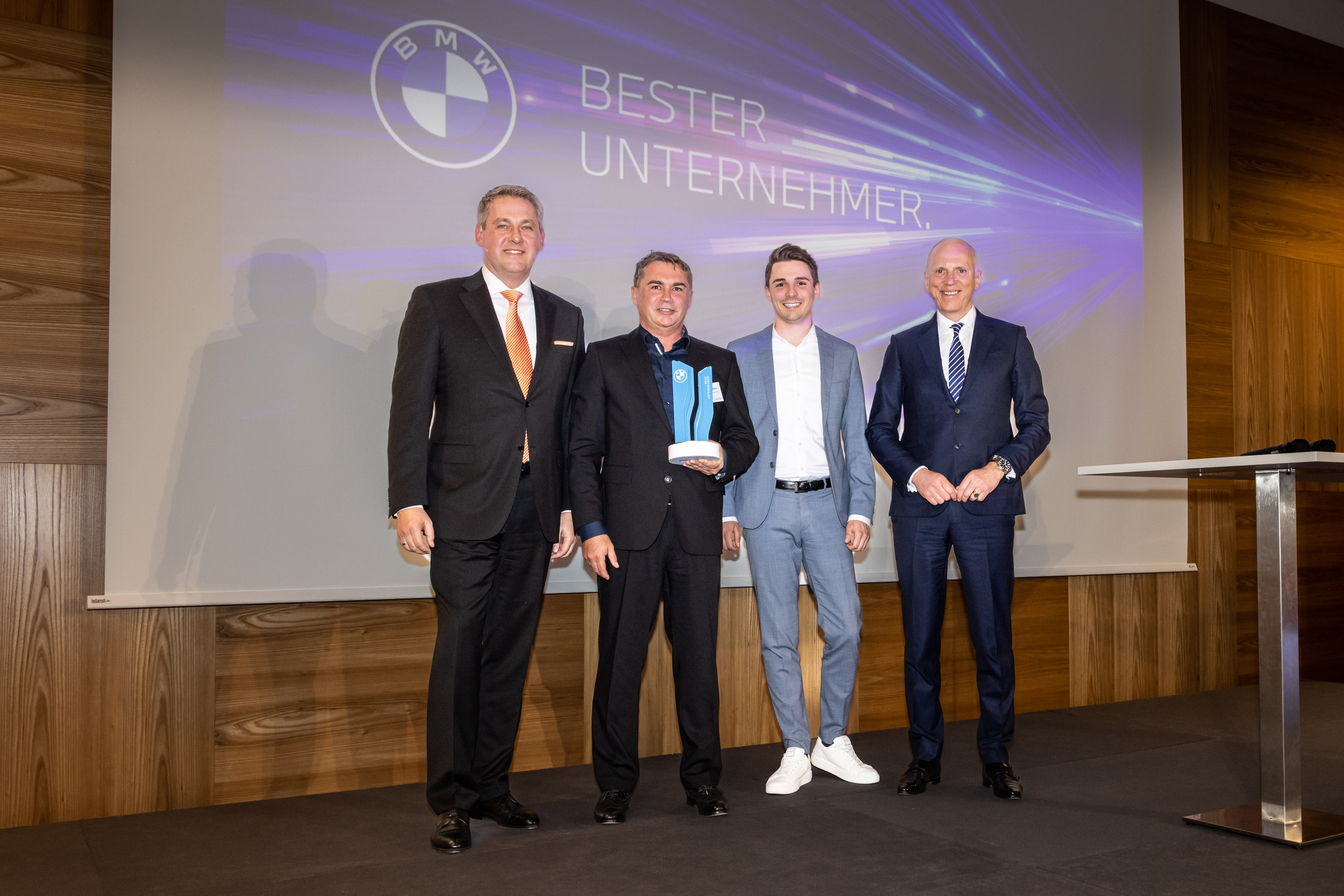 BMW Awards: BMW Deutschland zeichnet beste Handelspartner 2022 aus. V.l.n.r.: Stefan Teuchert, Leiter BMW Group Markt Deutschland; Richard Wagner Senior und Junior; Pieter Nota, Mitglied des Vorstands der BMW AG, Kunde, Marken, Vertrieb (03/2023).