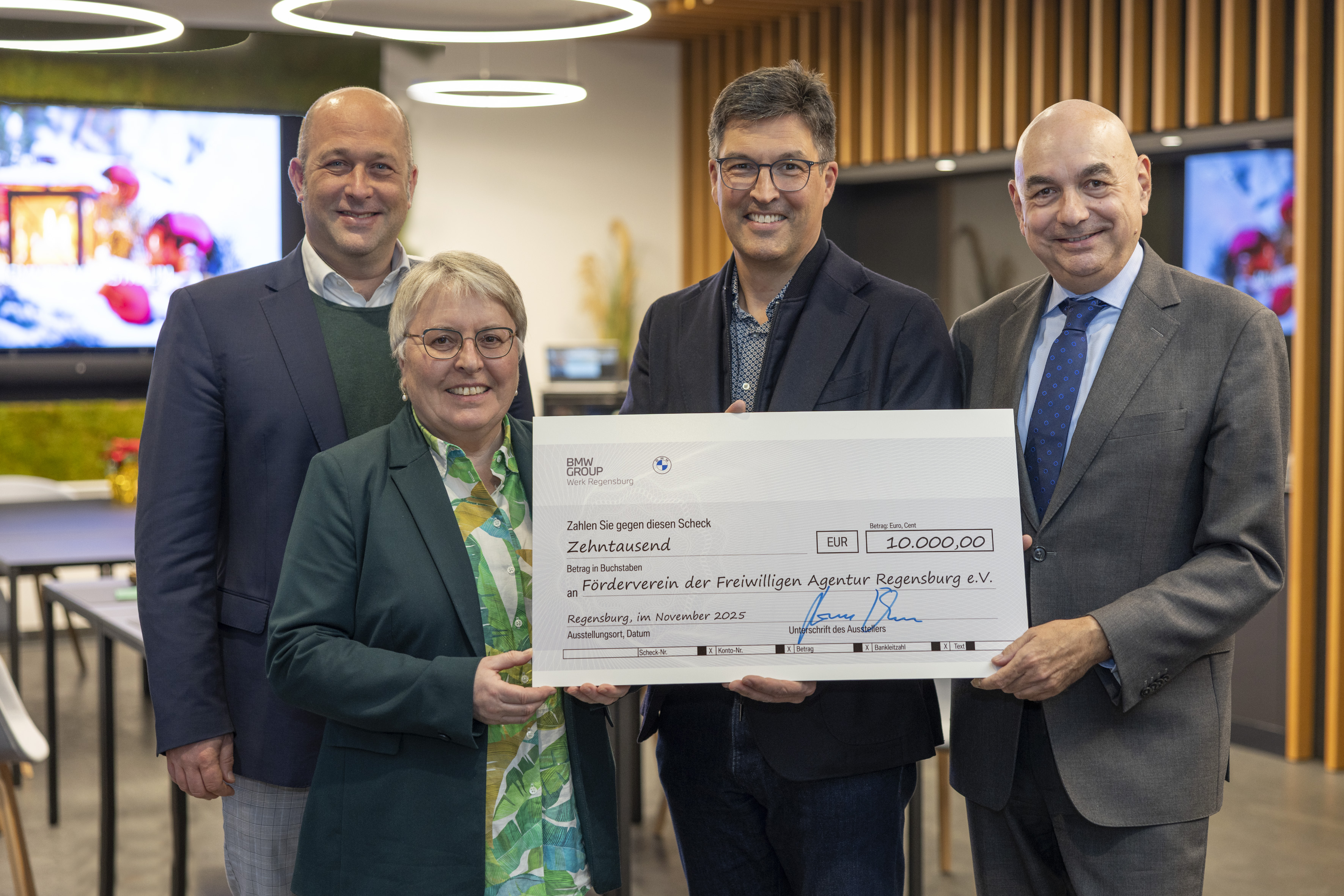 Tag des Ehrenamts: BMW Group Werk Regensburg spendet 10.000 Euro an den Förderverein der FreiwilligenAgentur: Werkleiter Armin Ebner würdigt Einsatz aller Ehrenamtlichen zum Wohle der Allgemeinheit. MdL Jürgen Mistol, erster Vorsitzender des Fördervereins der FreiwilligenAgentur Regensburg e.V. nahm die Spende zusammen mit der Maria Simon, Leiterin der FreiwilligenAgentur Regensburg, entgegen. (11/2025)