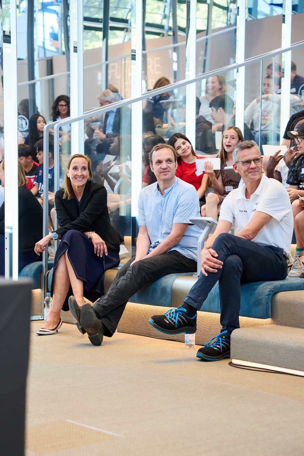 Kidz Summit 2023: (V.l.n.r.) Tatjana Bister (Leiterin der BMW Welt), Dr. Frank Steinbeck (Kurator Sammlungsbereich Landverkehr im Deutschen Technikmuseum Berlin) und Dr. Peter Weber (Leiter des BMW Group Werk München) bei der Abschlussveranstaltung am 7. Juli 2023 im FUTURE FORUM by BMW Welt. Foto: Fabian Kirchbauer. (07/2023)