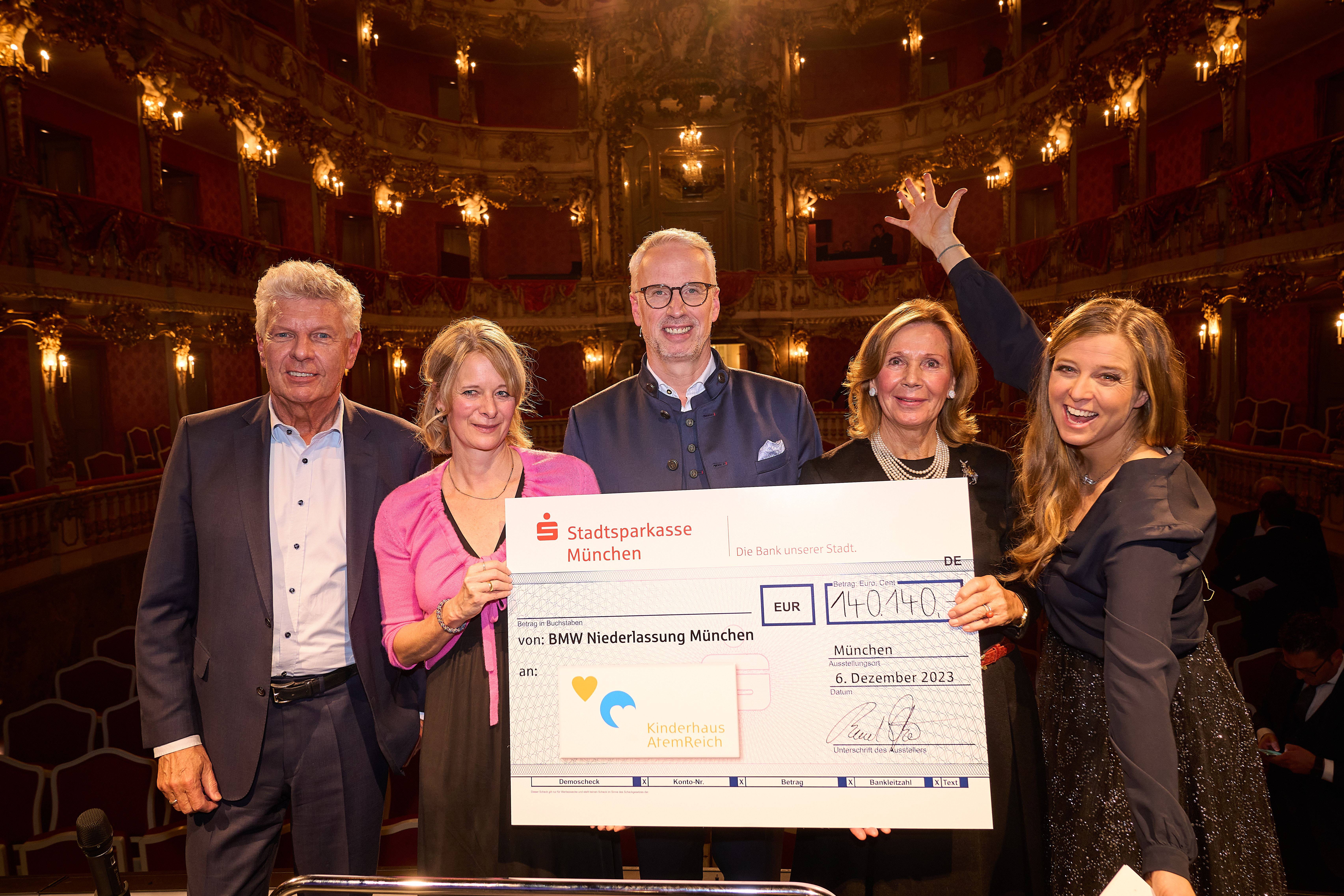 28. Advents-Benefizkonzert der BMW Niederlassung und dem Bayerischen Staatsorchester. (V.l.n.r.): Dieter Reiter (Oberbürgermeister von München), Barbara Weltin (Geschäftsführerin Kinderhaus AtemReich), Bernd Döpke (Leiter BMW Niederlassung München), Ursula Prinzessin von Bayern und Nina Eichinger (Moderatorin). Foto: Jens Hartmann / BMW München (12/2023)