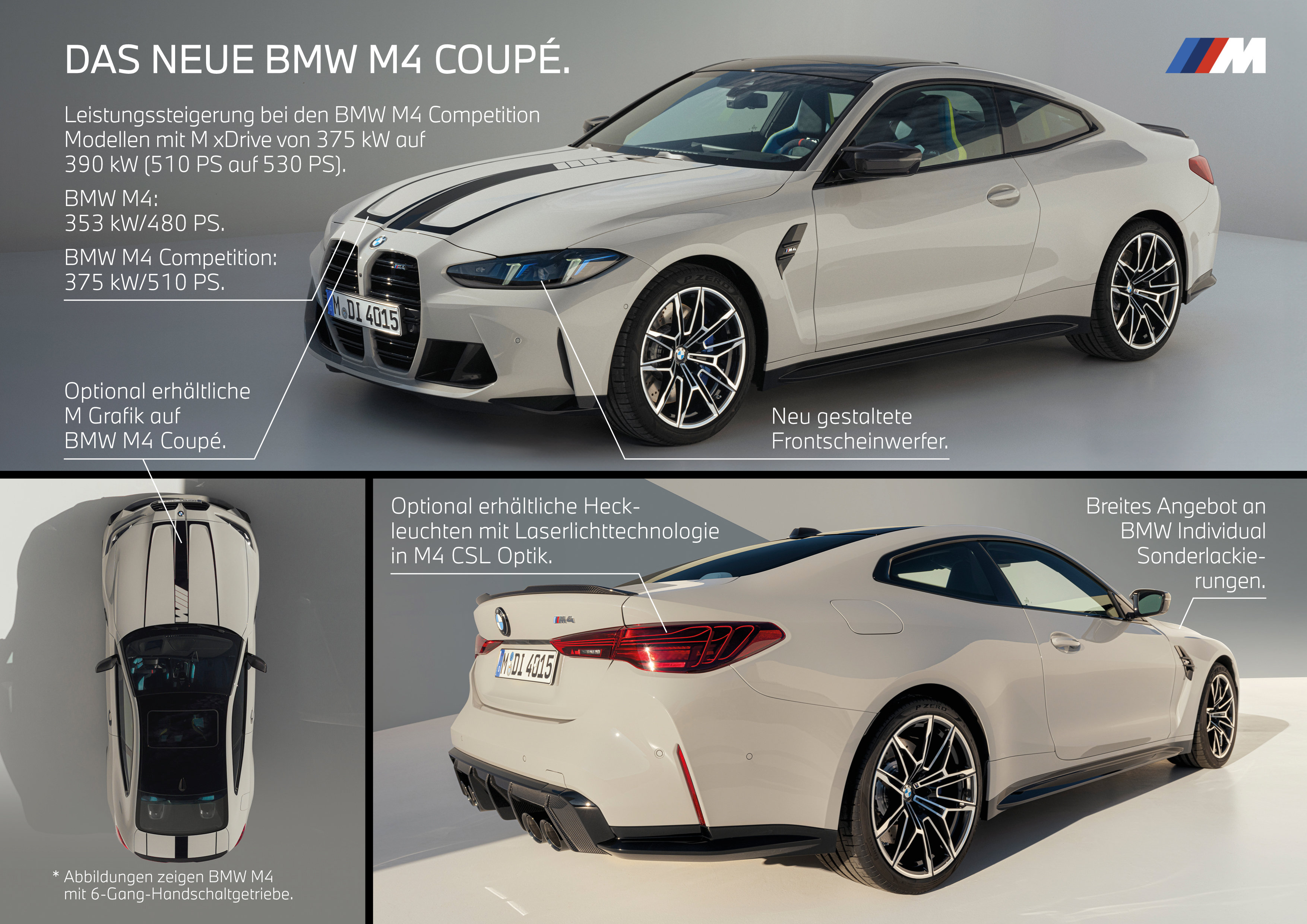 BMW M4 Competition Coupé mit M xDrive Kraftstoffverbrauch kombiniert: 10,1 – 10,0 l/100 km; CO2-Emissionen kombiniert: 229 – 226 g/km gemäß WLTP. BMW M4 Coupé (6-Gang-Handschaltung) Kraftstoffverbrauch kombiniert: 10,1 – 10,0 l/ 100 km; CO2-Emissionen kombiniert: 230 – 226 g/km gemäß WLTP. BMW M4 Competition Coupé (8-Gang M Steptronic) Kraftstoffverbrauch kombiniert: 9,9 – 9,7 l/ 100 km; CO2-Emissionen kombiniert: 230 – 226 g/km gemäß WLTP.