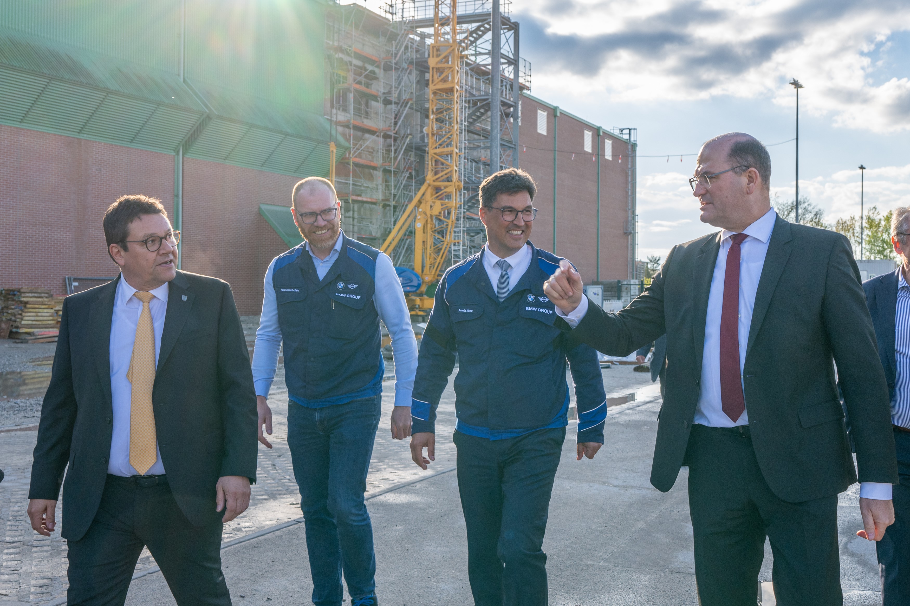 Staatsminister Albert Füracker und Armin Ebner, Leiter der BMW Group Werke Regensburg und Wackersdorf (v.r.) besichtigen gemeinsam mit dem Wackersdorfer Bürgermeister Thomas Falter (links im Bild) die Baustelle des BMW Group Batterietestzentrums im Werk Wackersdorf. (04/2024)